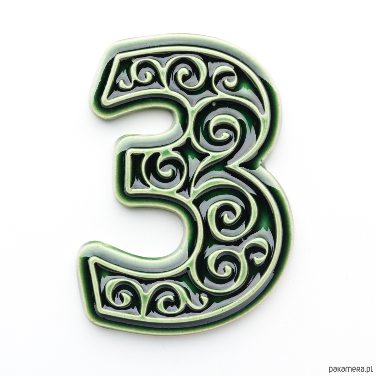 Ceramiczna cyfra 3 z ozdobnym, lekko wypukłym ornamentem, do zamocowania na drzwi mieszkania lub domu. Wykonana z jasnej gliny, pokryta błyszczącym szkliwem. Dwukrotnie wypalana w wysokiej temperaturze.