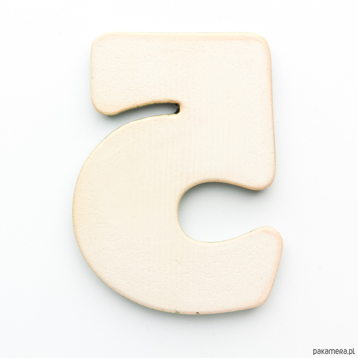 Ceramiczna cyfra 5 z ozdobnym, lekko wypukłym ornamentem, do zamocowania na drzwi mieszkania lub domu. Wykonana z jasnej gliny, pokryta błyszczącym szkliwem. Dwukrotnie wypalana w wysokiej temperaturze.
