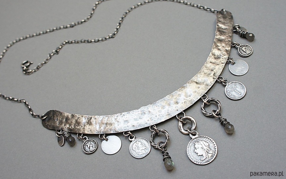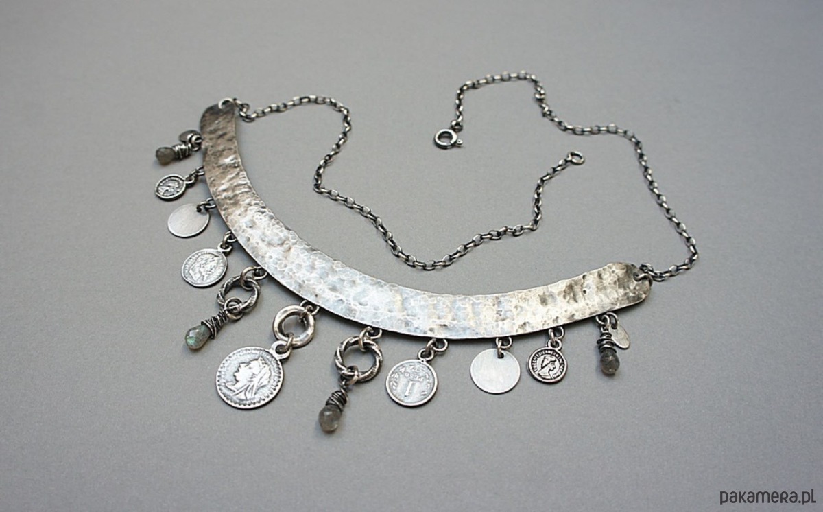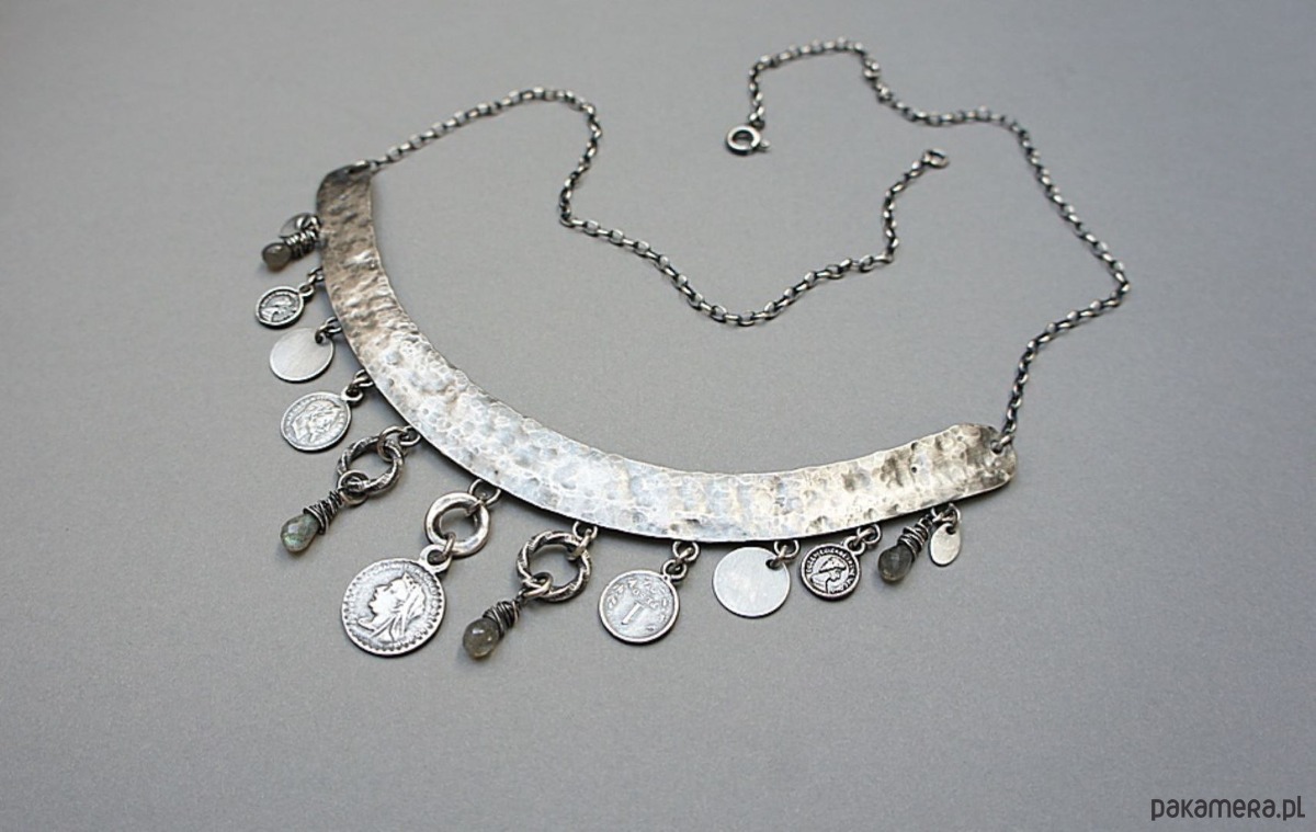 Naszyjnik - kolia wykonany własnoręcznie ze srebra [pr. 925] w połączeniu z brioletami labradorytów [7 - 8mm] oraz srebrnymi zawieszkami i blaszkami. Całość oksydowana i przetarta. Obwód naszyjnik około 51,5cm.