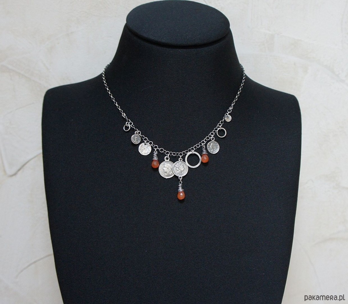 Naszyjnik wykonany ze srebra [pr. 925] w połączeniu z brioletkami fasetowanego karneolu [6mm] oraz srebrnymi blaszkami, ogniwami i imitacjami monet. Srebro oksydowane i przetarte. Całkowita długość naszyjnika 45,5cm. Biżuteria ozdobnie zapakowana