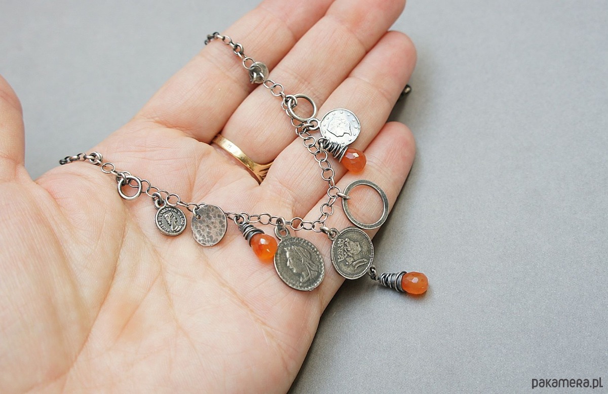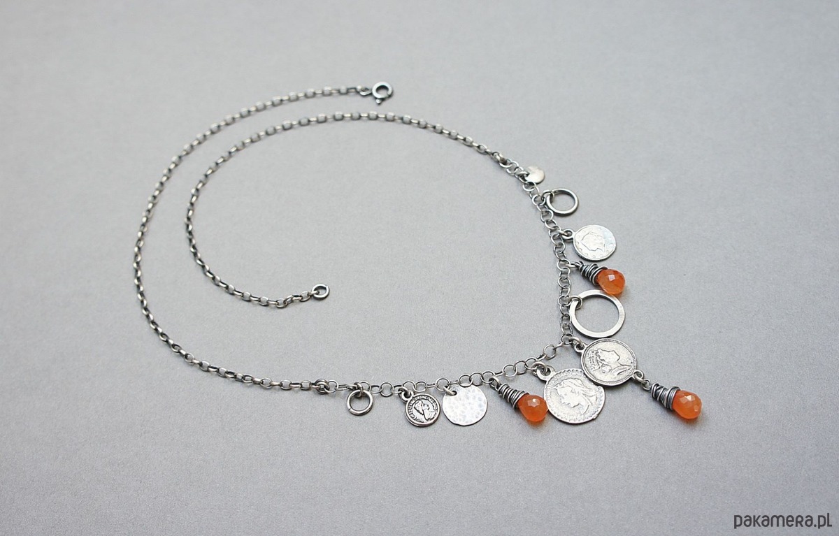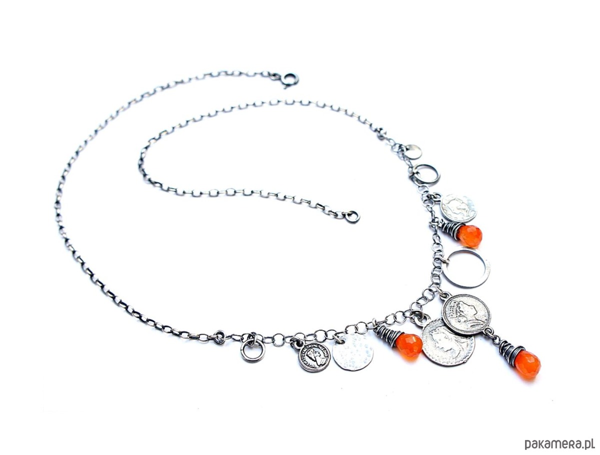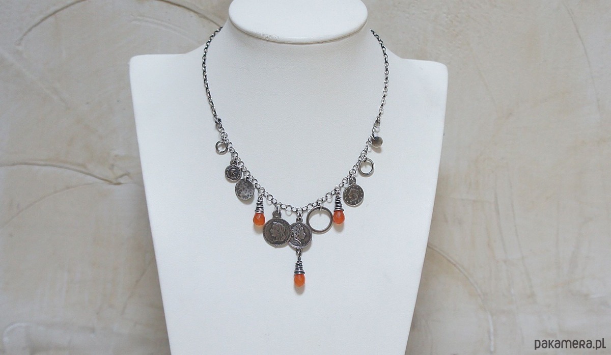 Naszyjnik wykonany ze srebra [pr. 925] w połączeniu z brioletkami fasetowanego karneolu [6mm] oraz srebrnymi blaszkami, ogniwami i imitacjami monet. Srebro oksydowane i przetarte. Całkowita długość naszyjnika 45,5cm. Biżuteria ozdobnie zapakowana