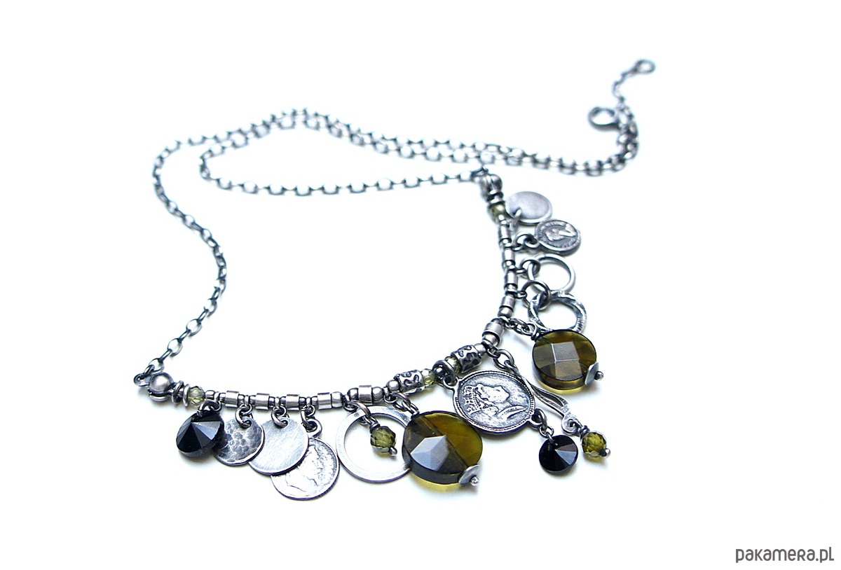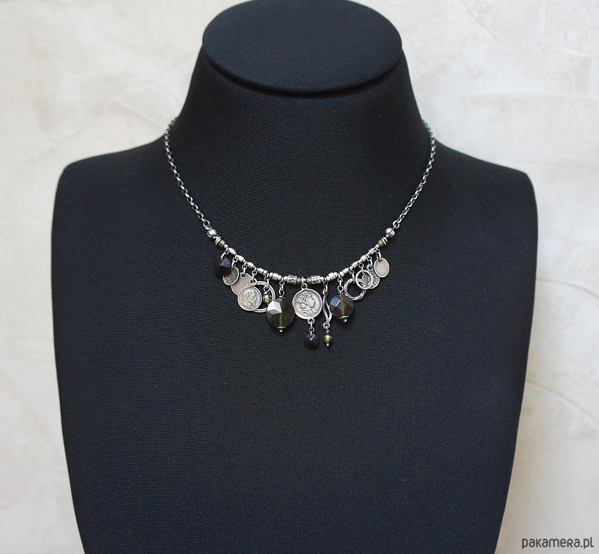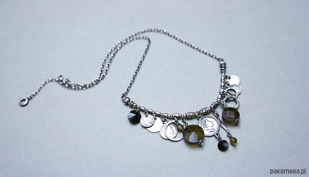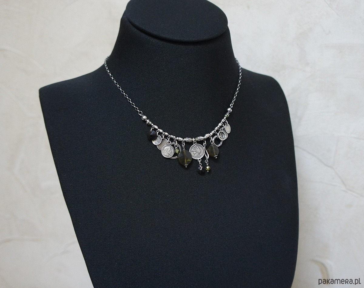Naszyjnik wykonany ze srebra [pr. 925] w połączeniu z fasetowanymi monetkami kwarców [12mm i 10mm], kryształkami Swarovski [8mm i 6mm], cyrkoniami [4mm i 3mm] oraz srebrnymi blaszkami, ogniwami i imitacjami monet. Srebro oksydowane i przetarte. Całkowita długość naszyjnika 44cm. Biżuteria ozdobnie zapakowana