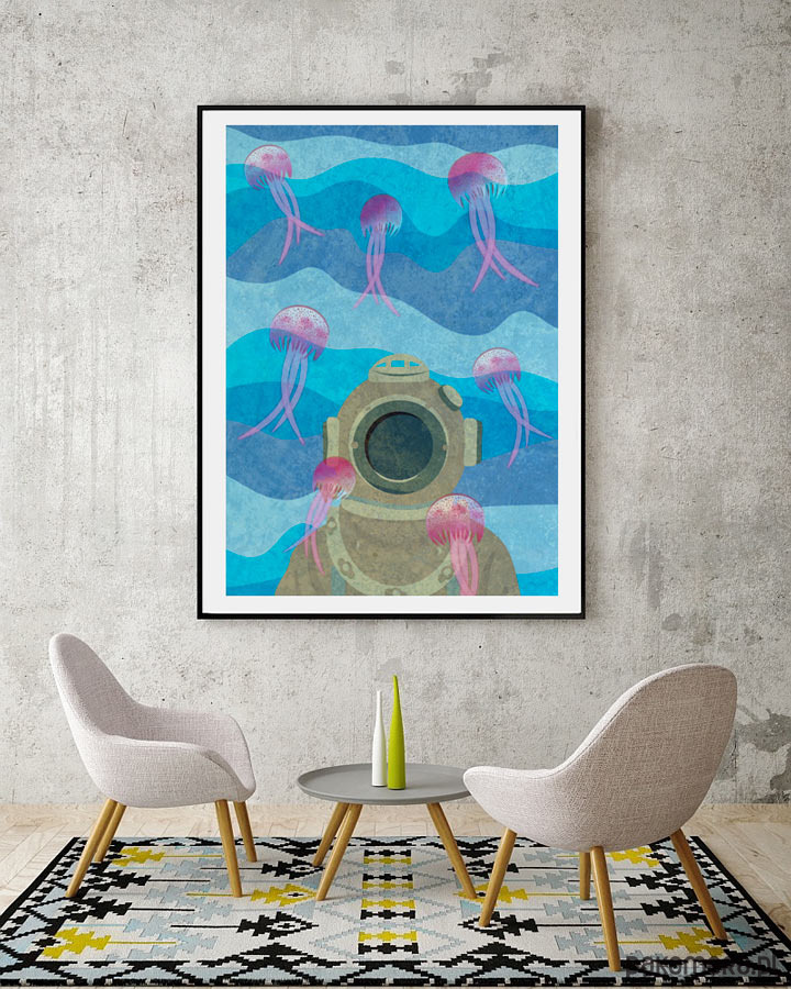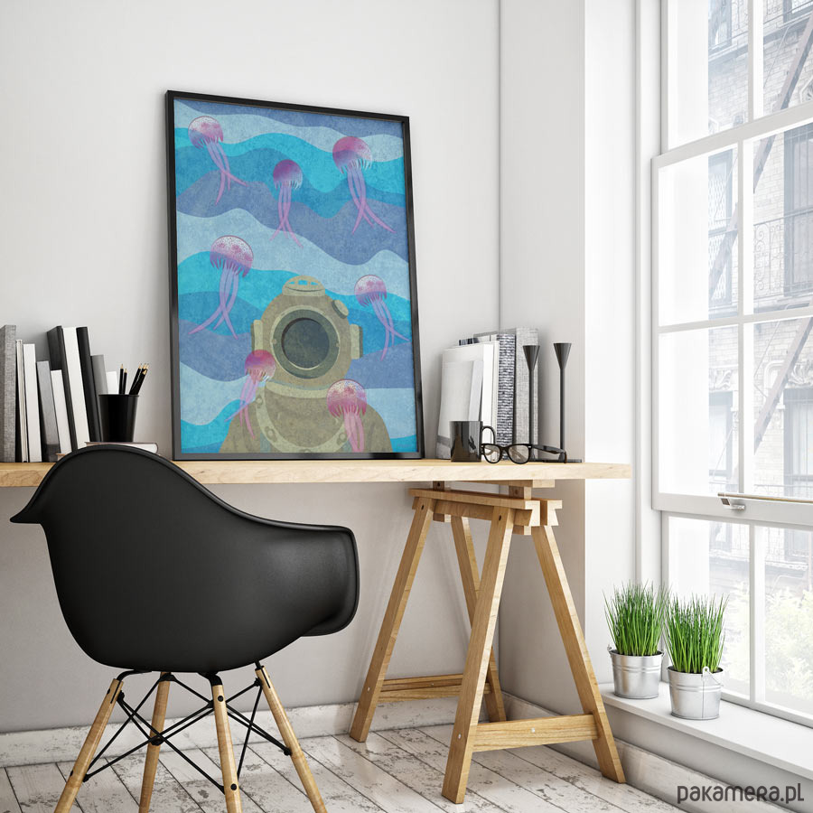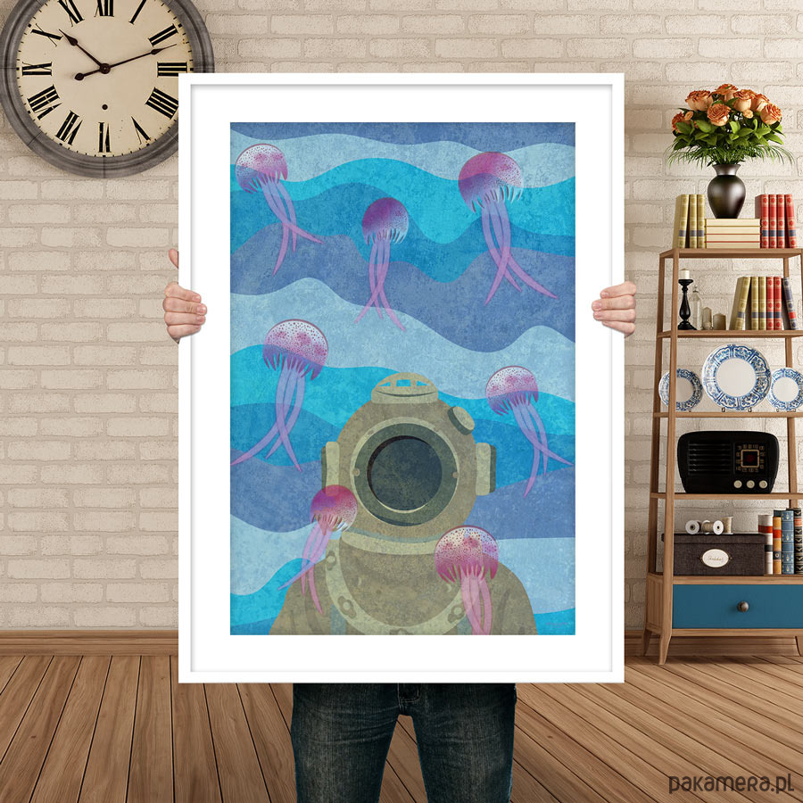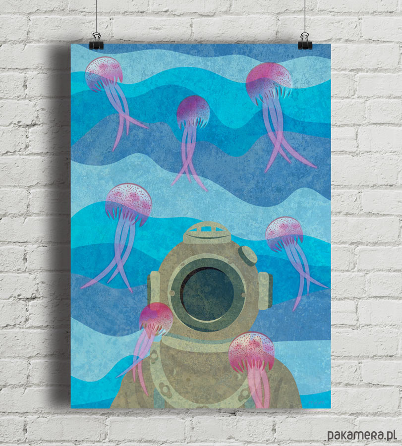 Plakat z autorską grafiką przedstawiający podwodną scenę z nurkiem w starodawnym stroju w otoczeniu meduz.