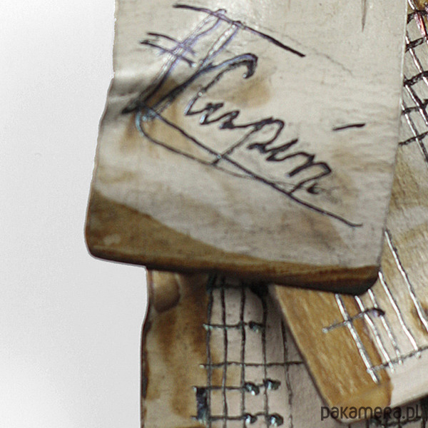 Wisiorek przypominający zapisane nutami kartki papieru ,zrobiłem ze srebra oksydowanego , grawerowanego i tytanu.Wisiorek zawieszony jest na rzemieniu naturalnym ,regulowanej długości. Kartka jest wielkości ;długość z piórkiem 7,3 cm i szerokości 3,0 cm. Z tyłu sygnowany wygrawerowanym podpisem.Można zamówić z własnym tekstem.