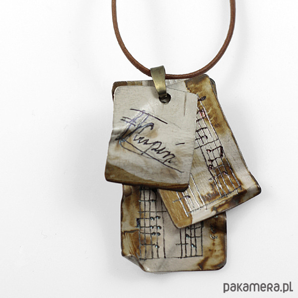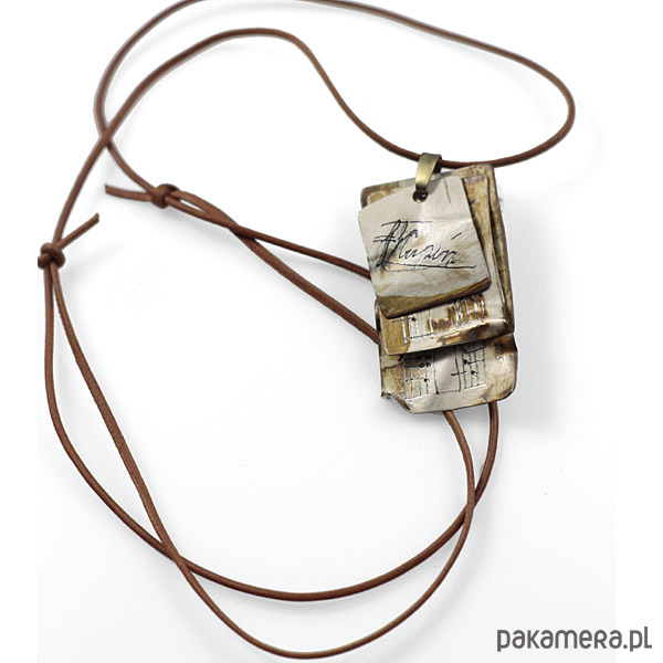 Wisiorek przypominający zapisane nutami kartki papieru ,zrobiłem ze srebra oksydowanego , grawerowanego i tytanu.Wisiorek zawieszony jest na rzemieniu naturalnym ,regulowanej długości. Kartka jest wielkości ;długość z piórkiem 7,3 cm i szerokości 3,0 cm. Z tyłu sygnowany wygrawerowanym podpisem.Można zamówić z własnym tekstem.