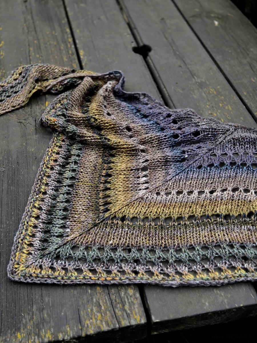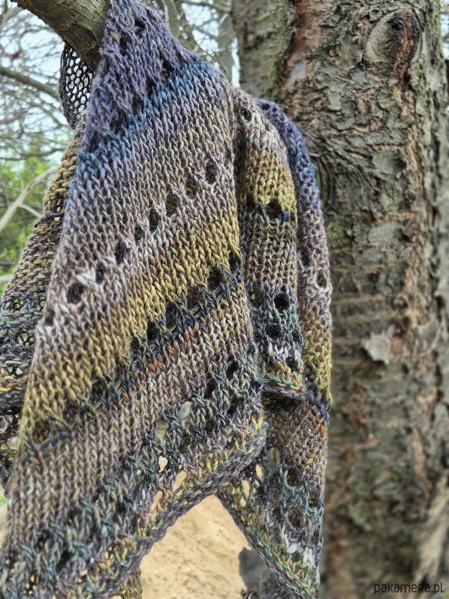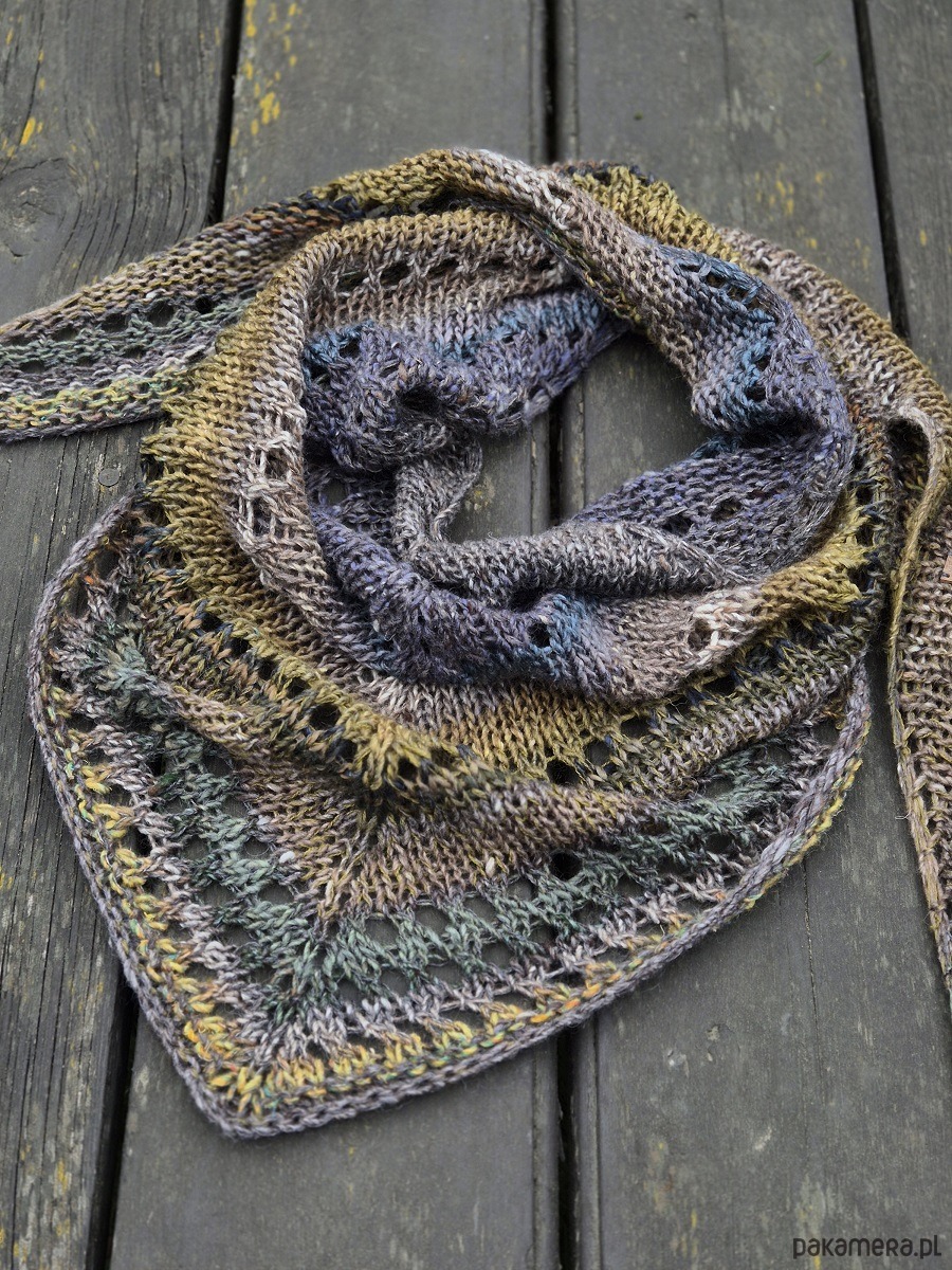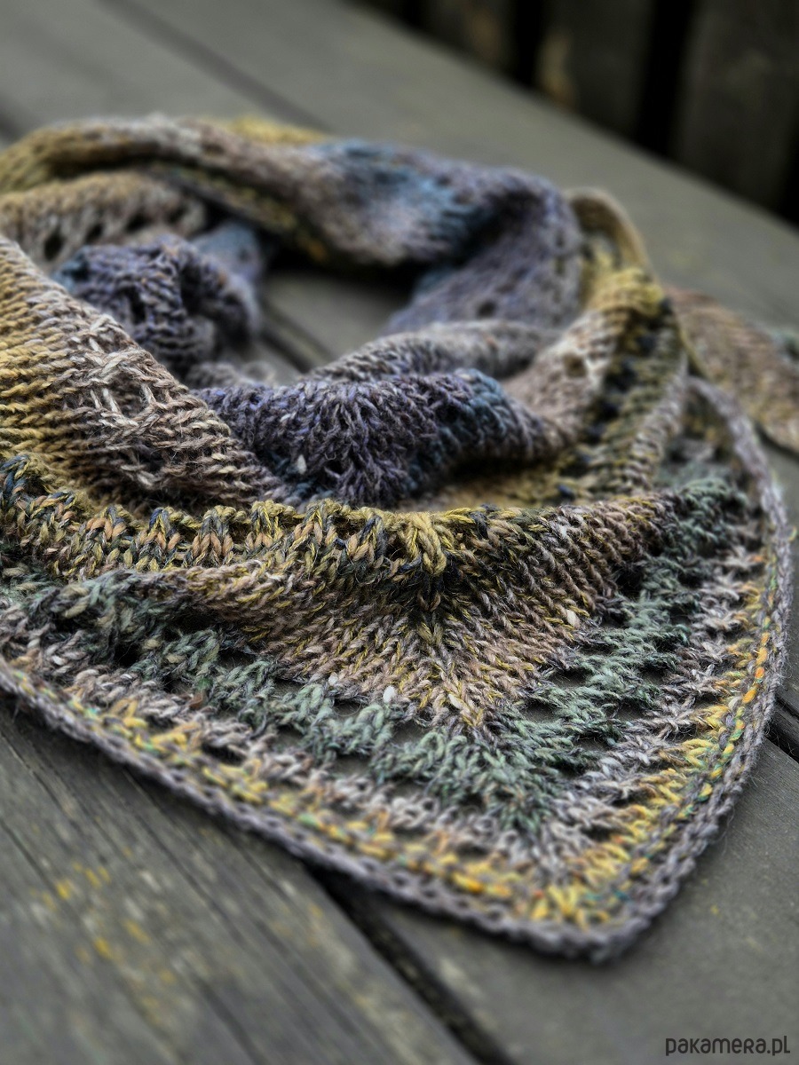 Klasyczna, średniej wielkości chusta wykonana z cudownej japońskiej Noro: włóczka jakby zgrzebna ze zgrubieniami i pięknymi niuansami kolorystycznymi.