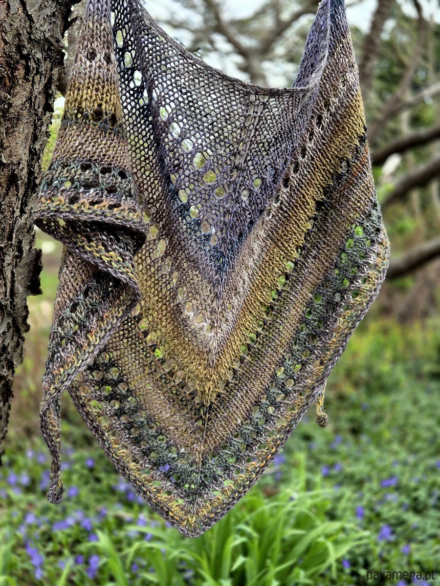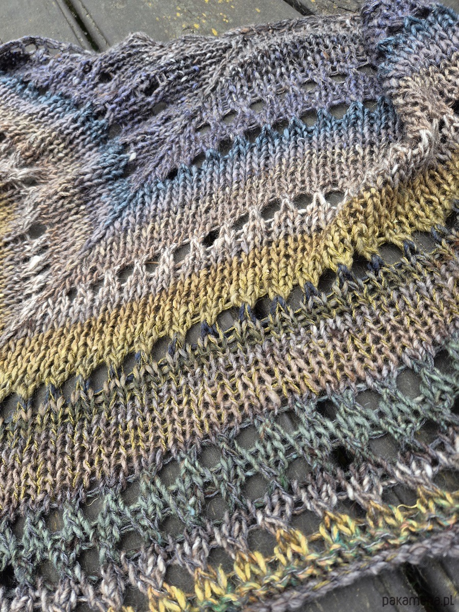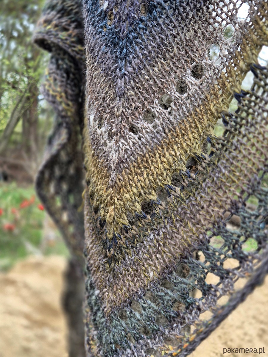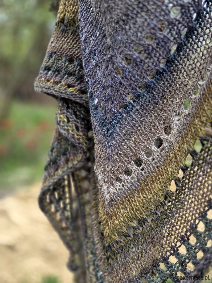 Klasyczna, średniej wielkości chusta wykonana z cudownej japońskiej Noro: włóczka jakby zgrzebna ze zgrubieniami i pięknymi niuansami kolorystycznymi.