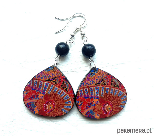kolczyki drewniane, ozdobione metodą decoupage, dwustronne, starannie wykończone farbami akrylowymi i zabezpieczone wielokrotnie lakierem, drewniane koraliki, bigle posrebrzane, długość kolczyków bez bigli: 4,5 cm, szerokość: 3 cm, bardzo lekkie