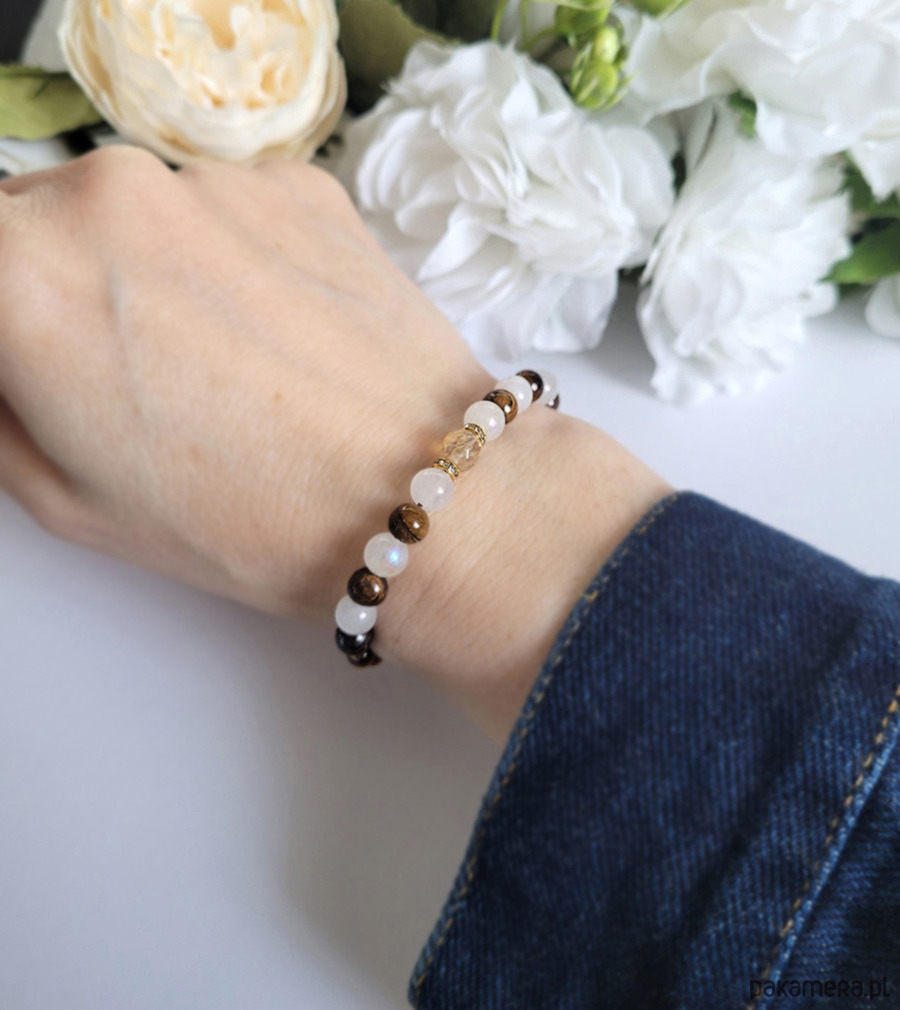 Przepiękna bransoletka z kolekcji "Queen of light z cytrynem" zrobiona z kamieni naturalnych: Cytrynu,Kamienia księżycowego, Tygrysiego oka oraz Hematytu.