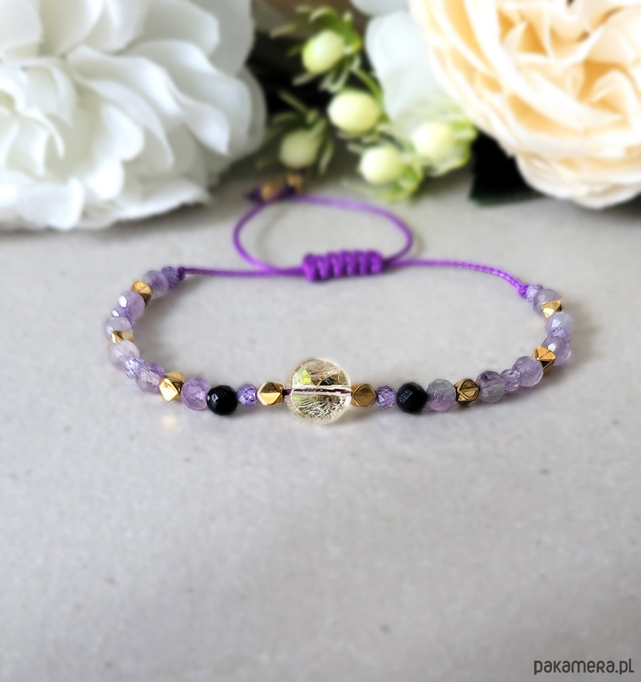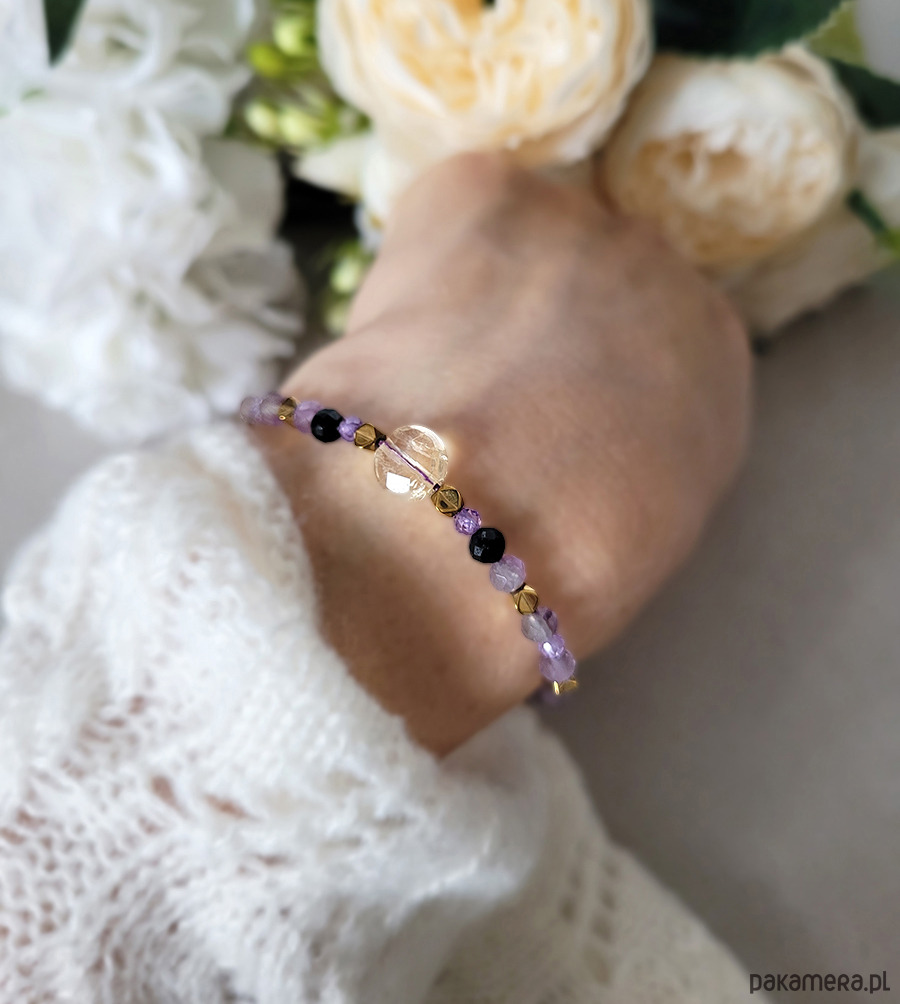 Jedyna szt. Piękna bransoletka zrobiona z kamieni naturalnych: Turmalinu, Cytrynu, Ametystu, Hematytu w kolorze złota oraz Cyrkonii.