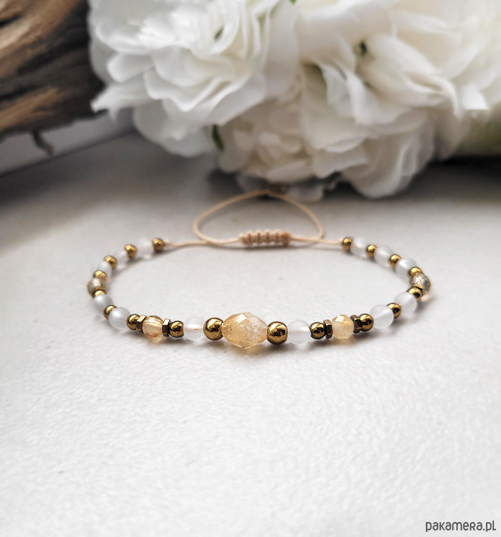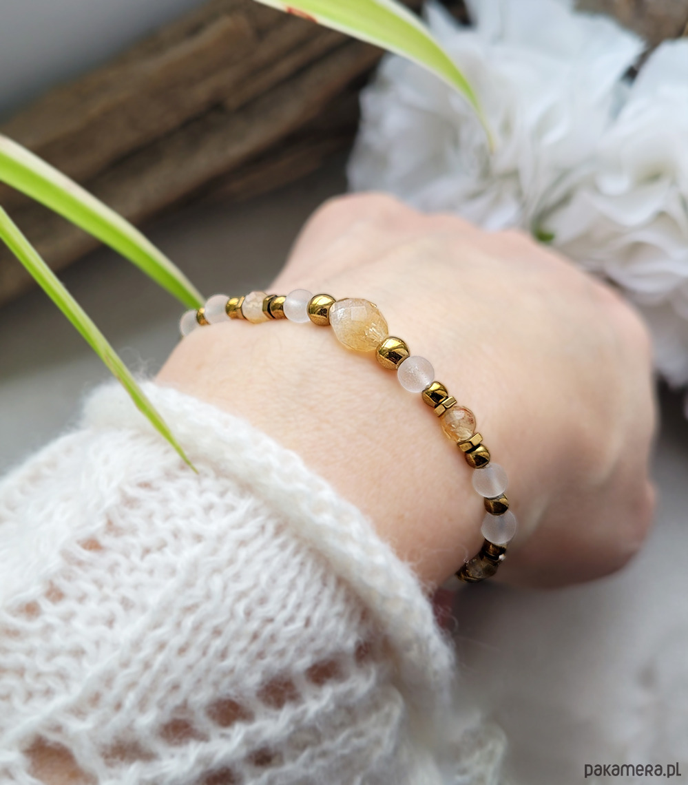 Przepiękna bransoletka zrobiona z kamieni naturalnych: Cytrynu, Kryształu górksiego oraz Hematytu w kolorze złota.