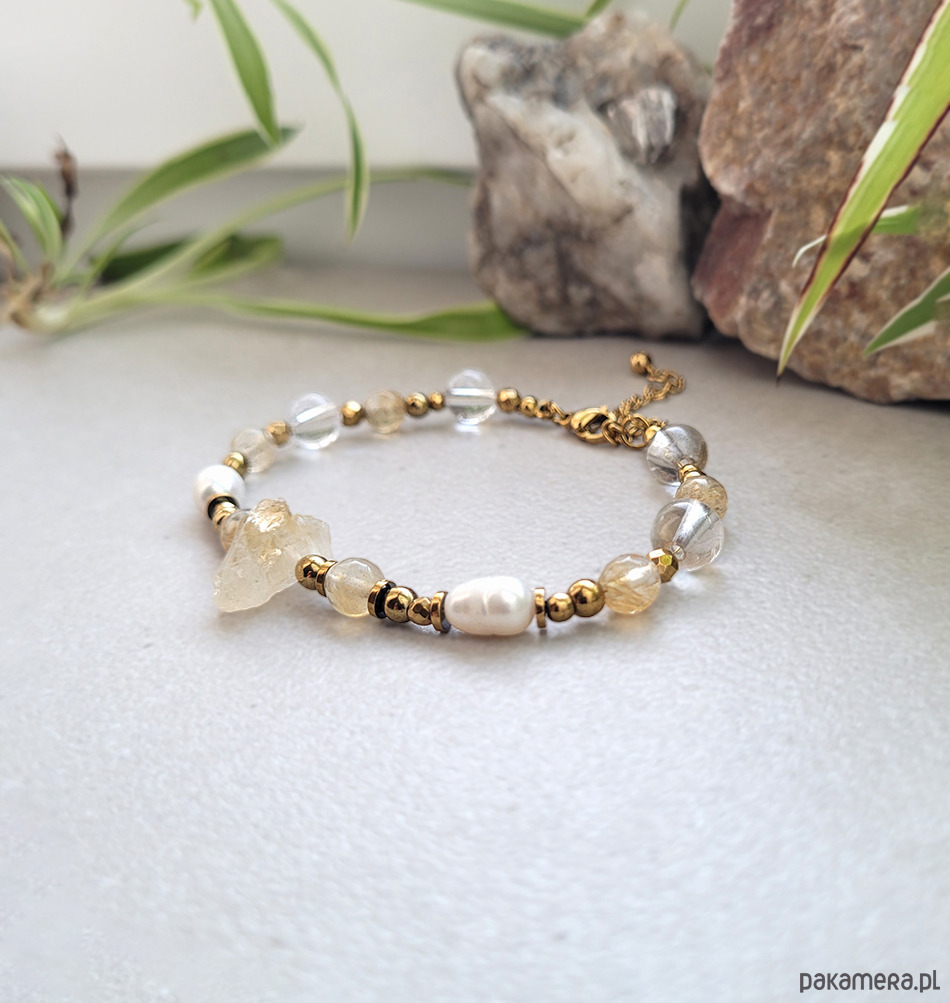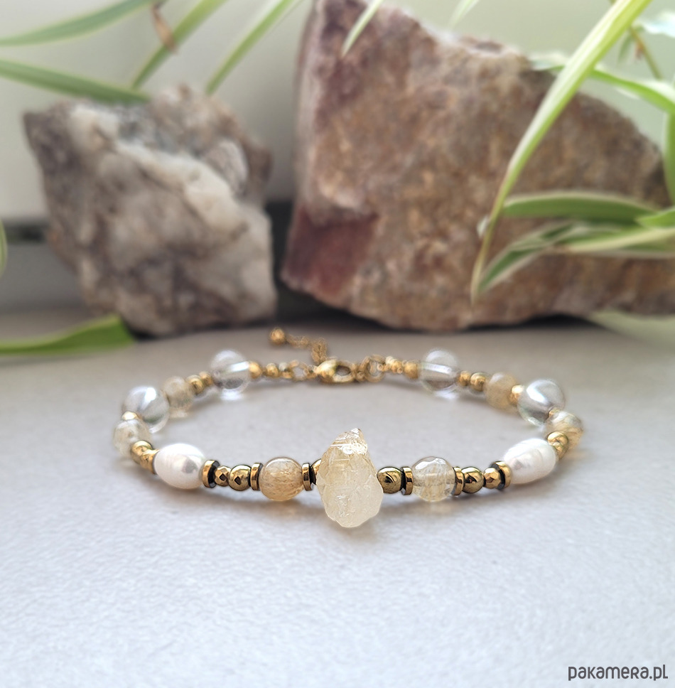 Piękna elegancka bransoletka zrobiona z kamieni naturalnych: Cytrynu, Kryształu górskiego, Pereł oraz Hematytu w kolorze złotym.