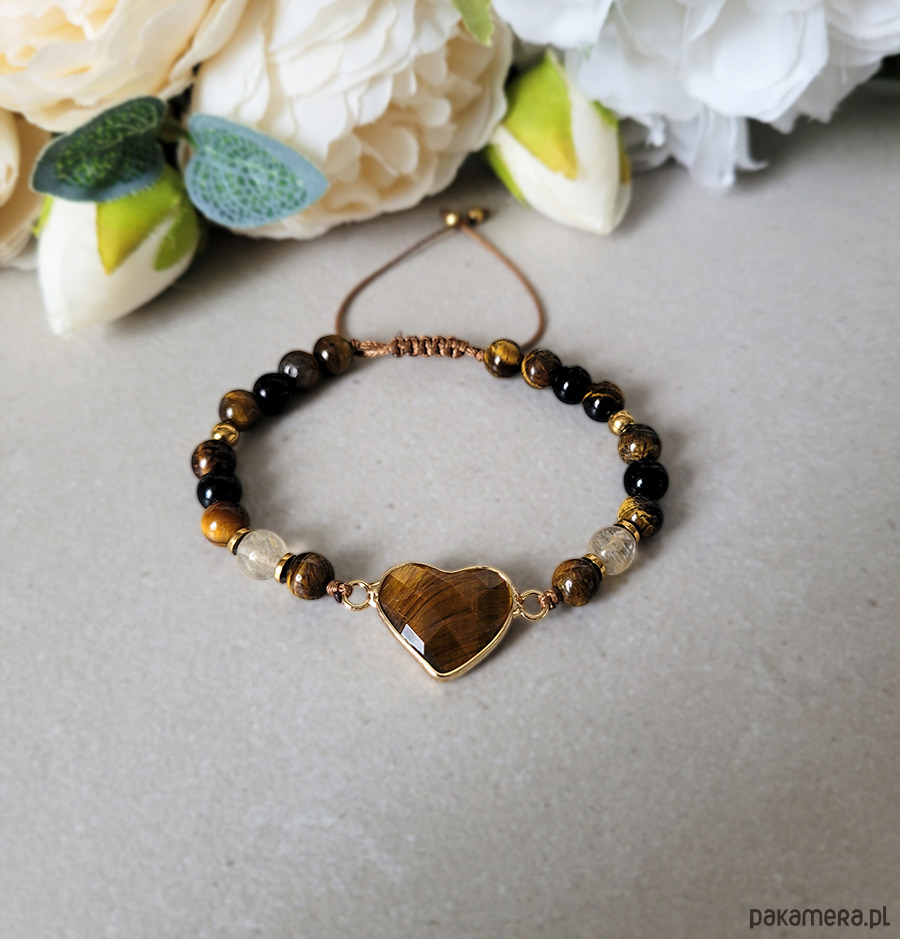 Piękna bransoletka zrobiona z kamieni naturalnych: Tygrysiego oka, Cytrynu, Onyksu oraz hematytu w kolorze złota.
