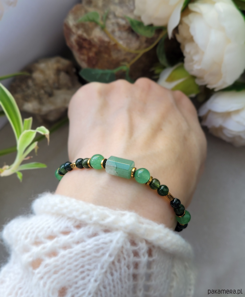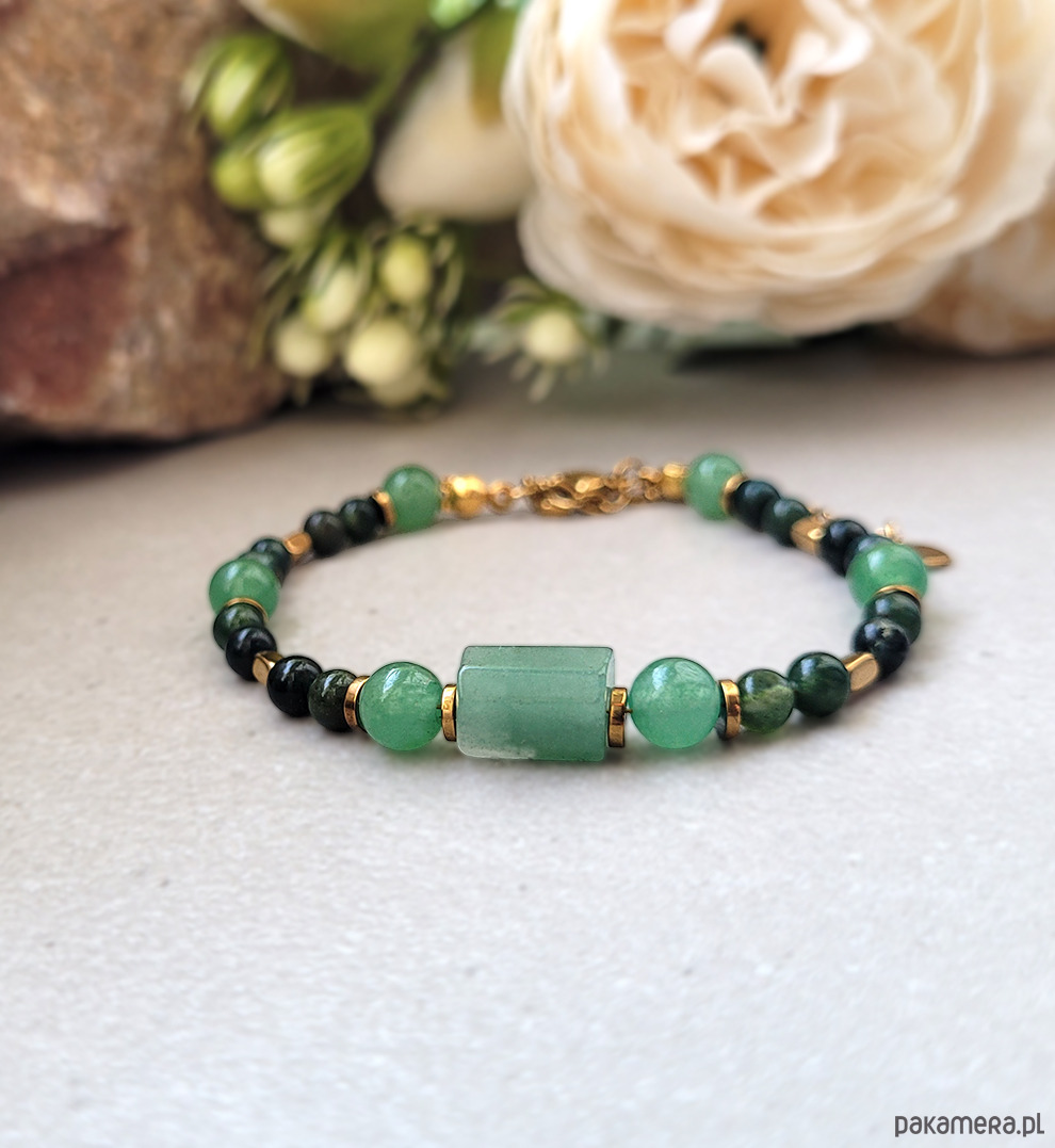 Przepiękna elegancka bransoletka zrobiona z kamieni naturalnych: Awenturynu, Agatu mszystego oraz Hematytu.