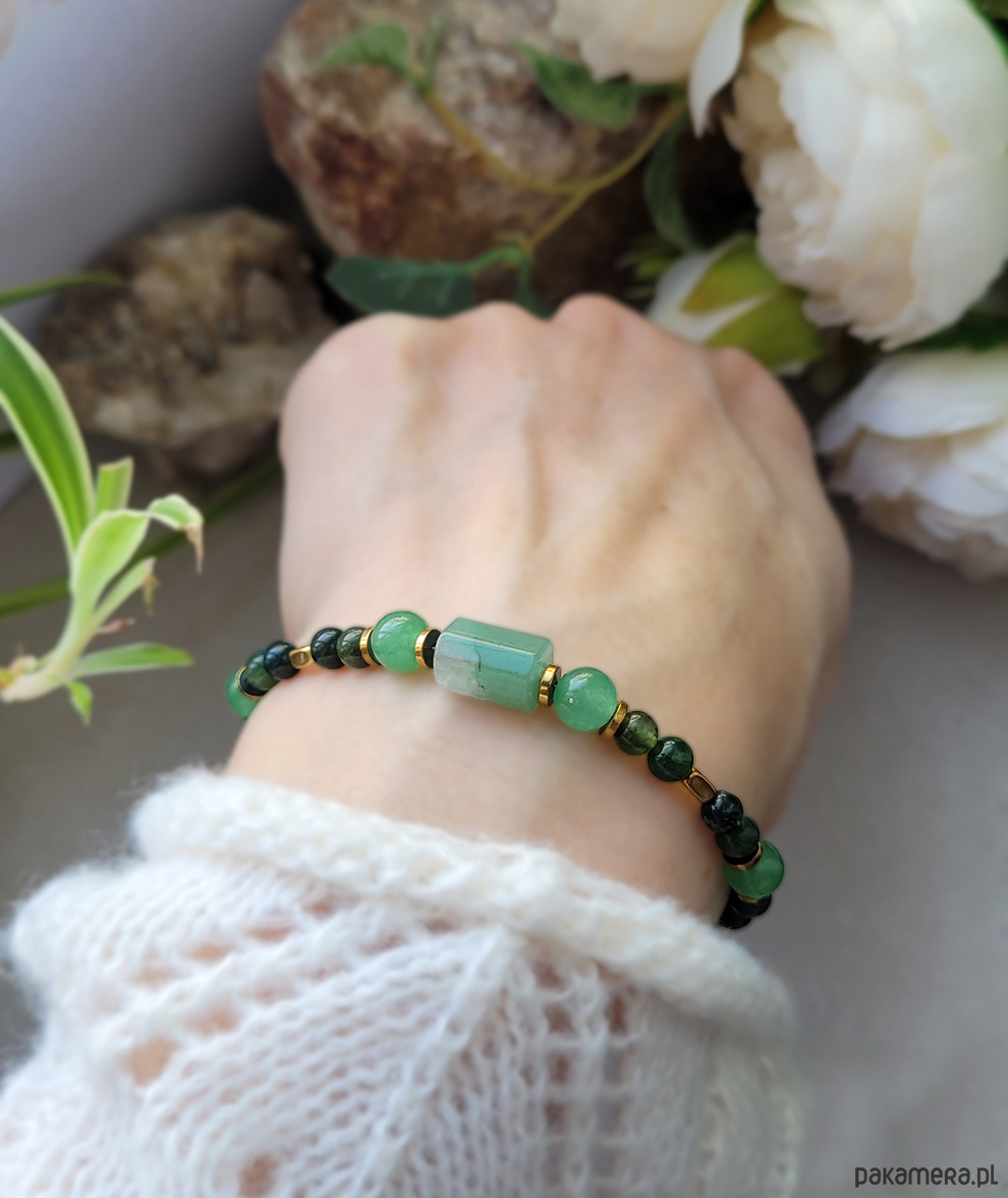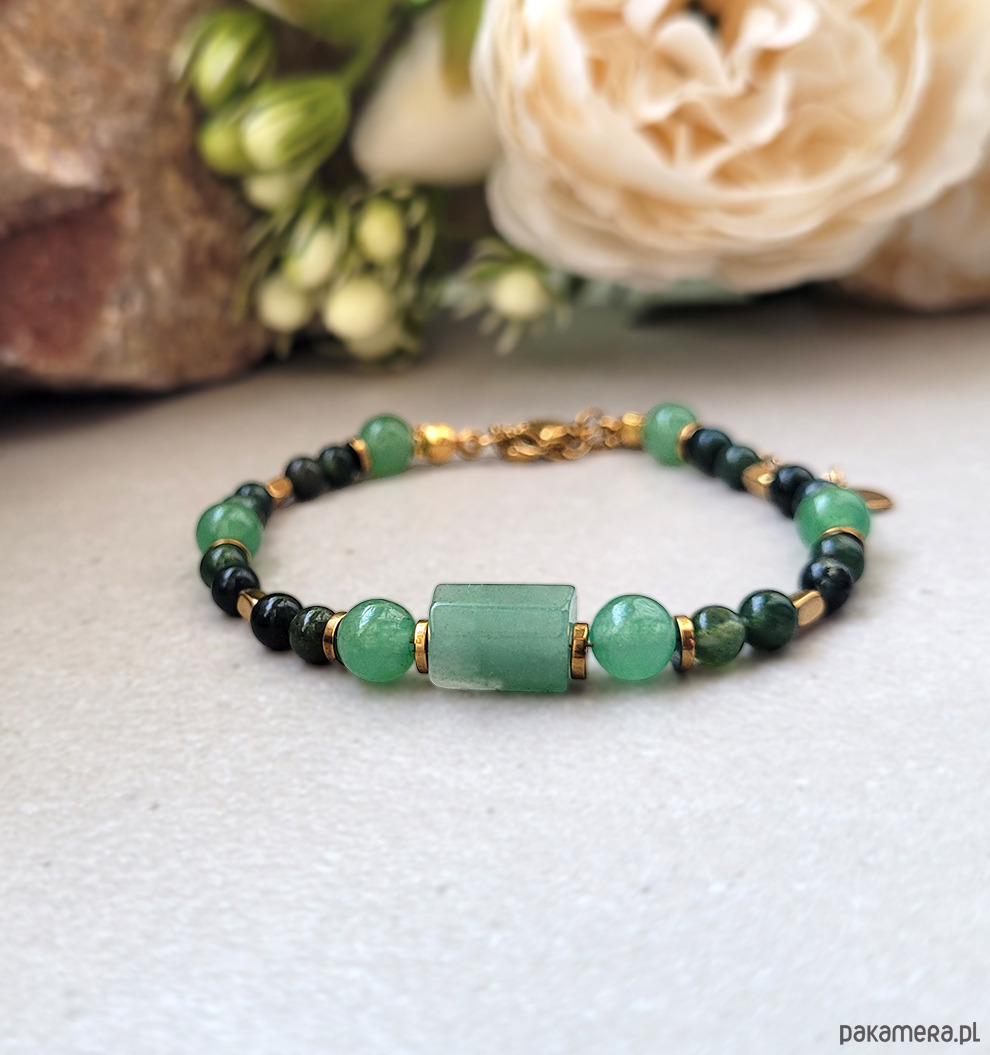 Przepiękna elegancka bransoletka zrobiona z kamieni naturalnych: Awenturynu, Agatu mszystego oraz Hematytu.