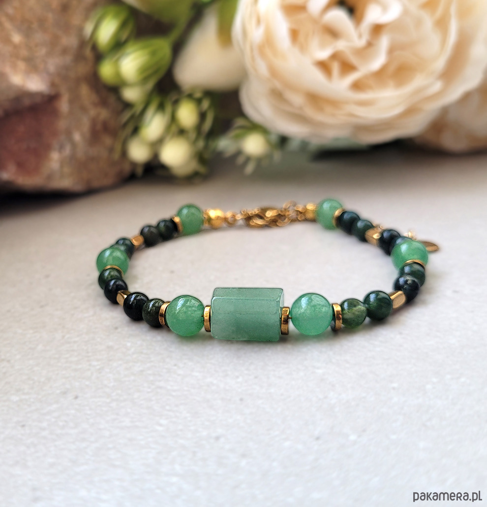 Przepiękna elegancka bransoletka zrobiona z kamieni naturalnych: Awenturynu, Agatu mszystego oraz Hematytu.