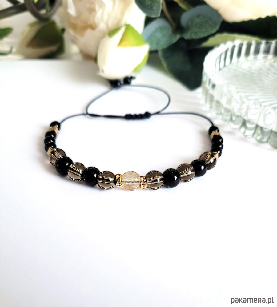 Przepiękna bransoletka z kolekcji "Queen of light z cytrynem" zrobiona z kamieni naturalnych: Cytrynu, Onyksu, Kwarcu dymnego oraz Hematytu w kolorze złota.