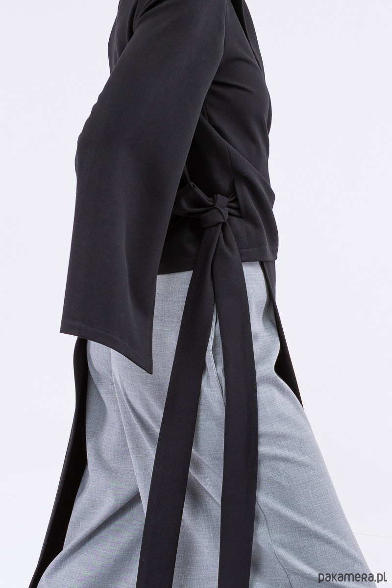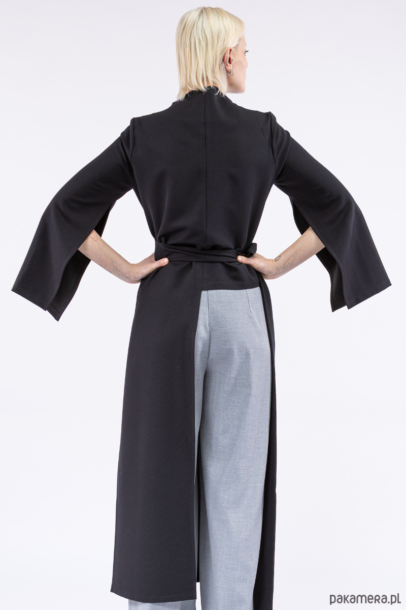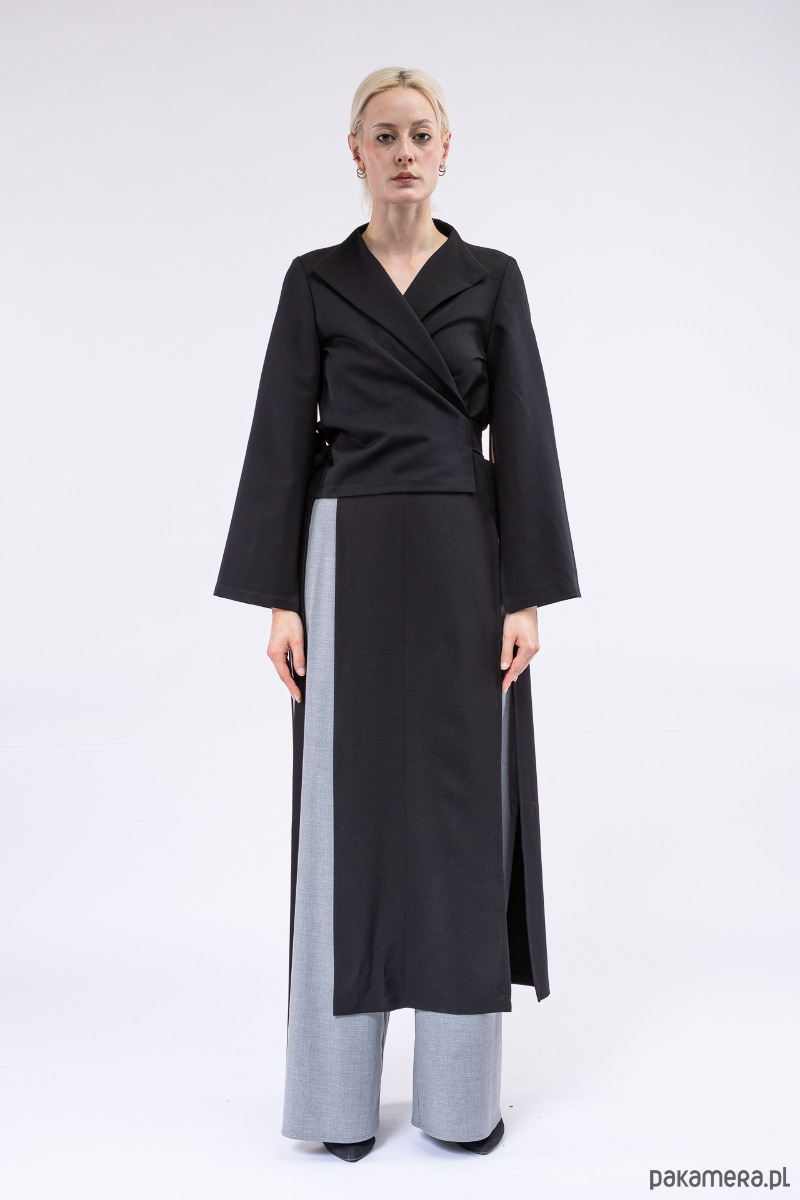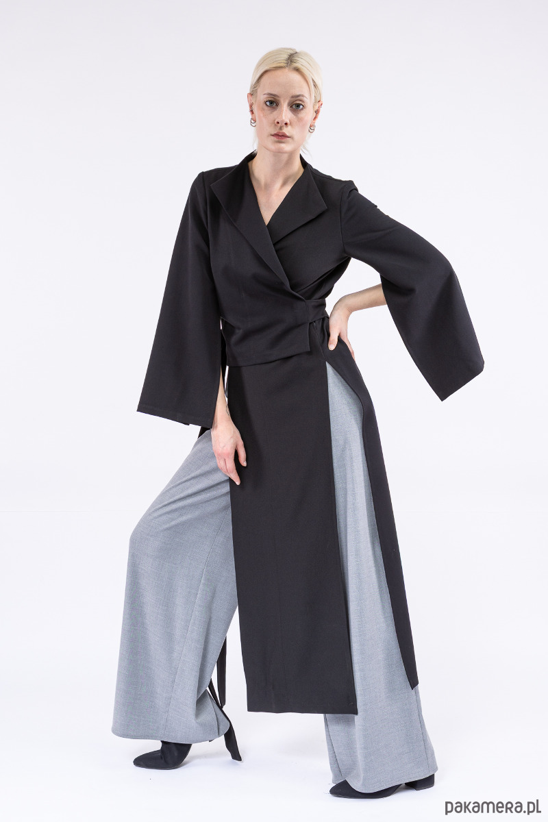 oryginalna, asymetryczna góra, jakkolwiek by nazwać ją płaszczem, dłuższym żakietem czy blezerem, z pękniętymi, szerokimi rękawami, z dlugimi paskami i otworami w bocznych szwach do dowolnego przewiązania się w talii,