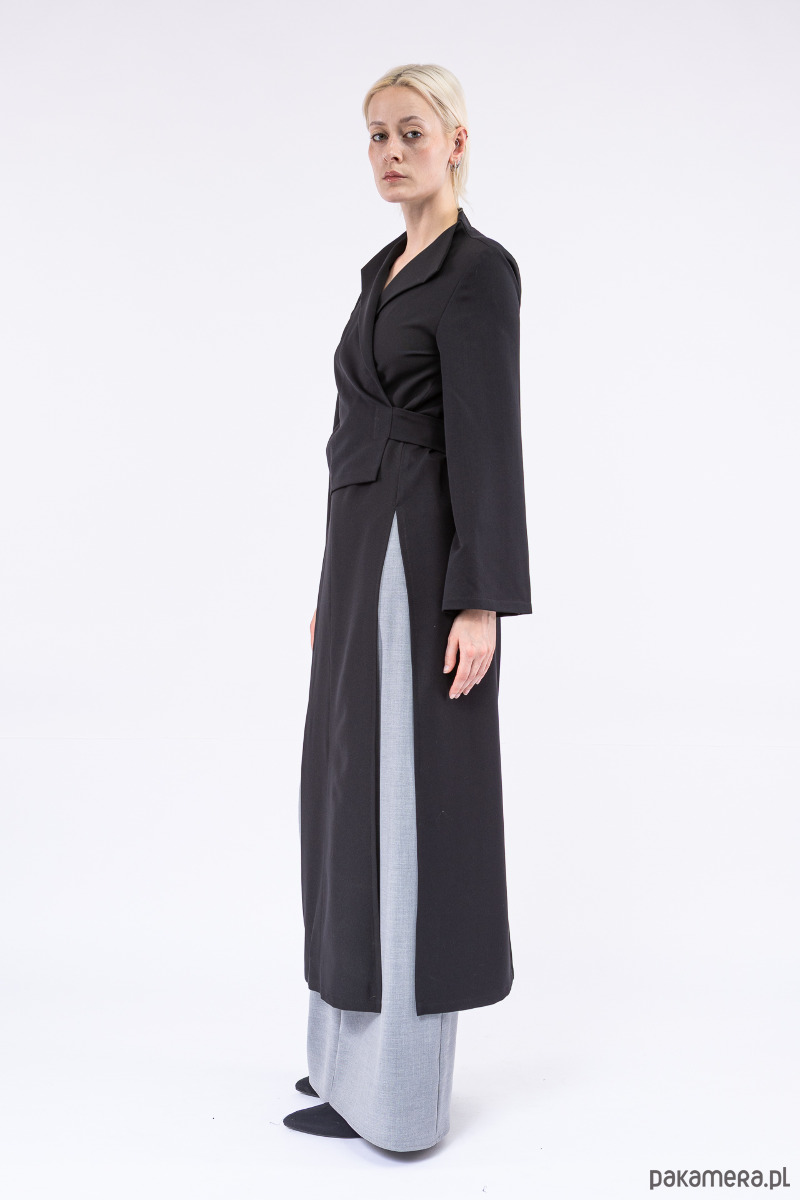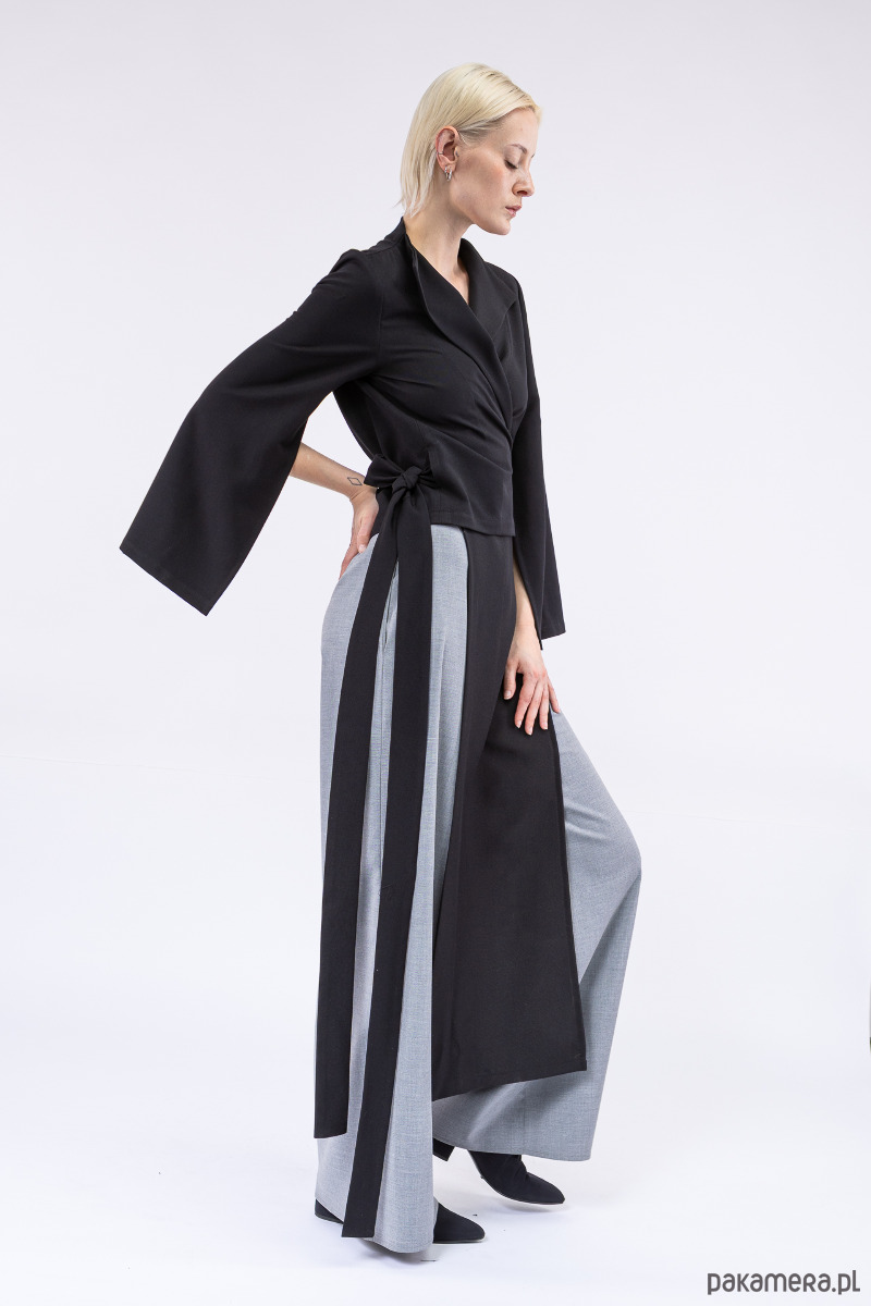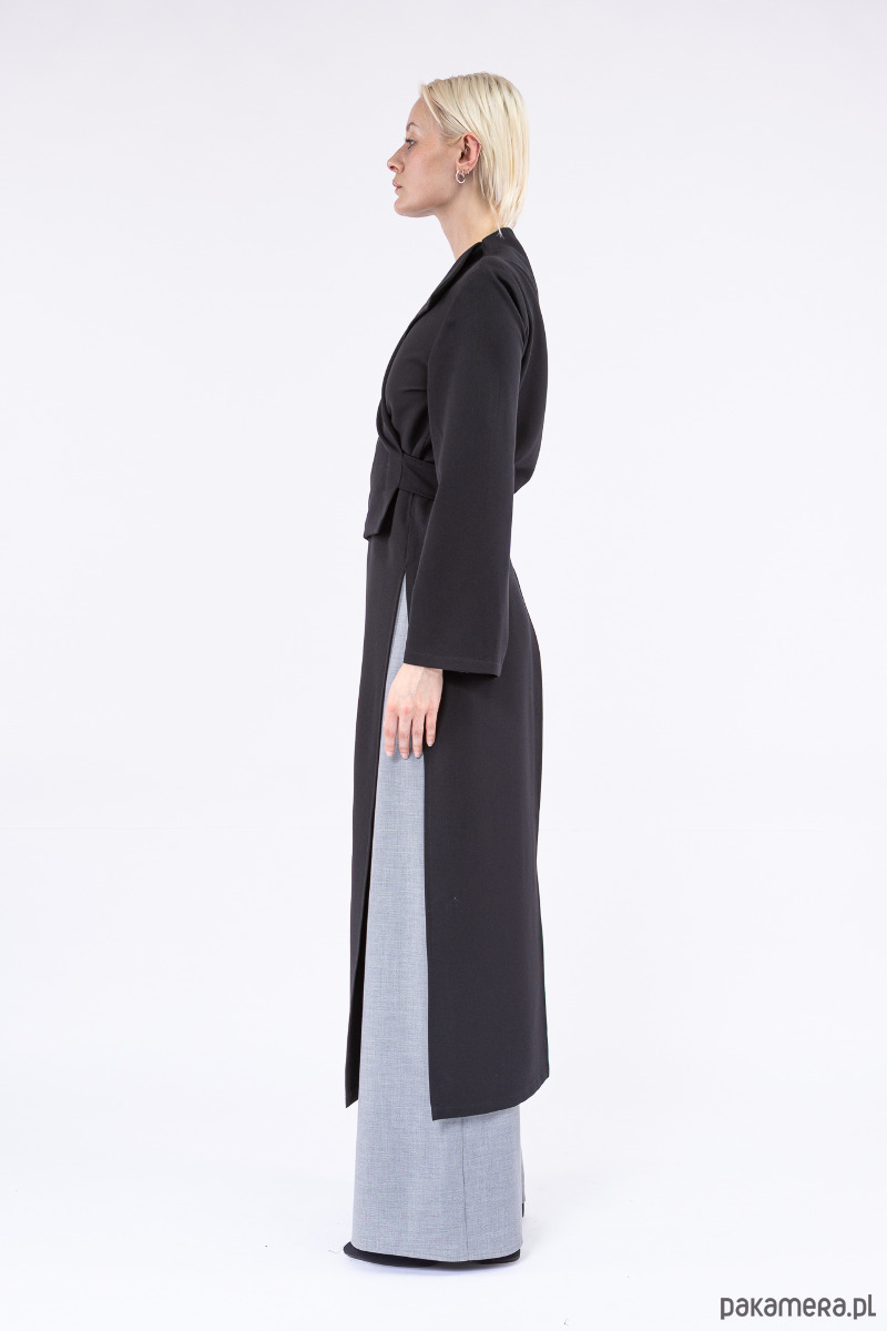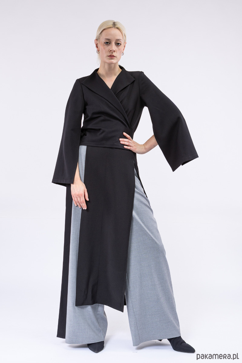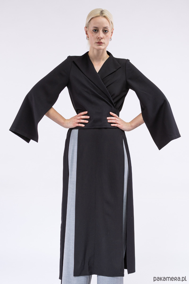 oryginalna, asymetryczna góra, jakkolwiek by nazwać ją płaszczem, dłuższym żakietem czy blezerem, z pękniętymi, szerokimi rękawami, z dlugimi paskami i otworami w bocznych szwach do dowolnego przewiązania się w talii,