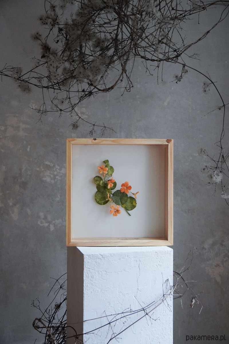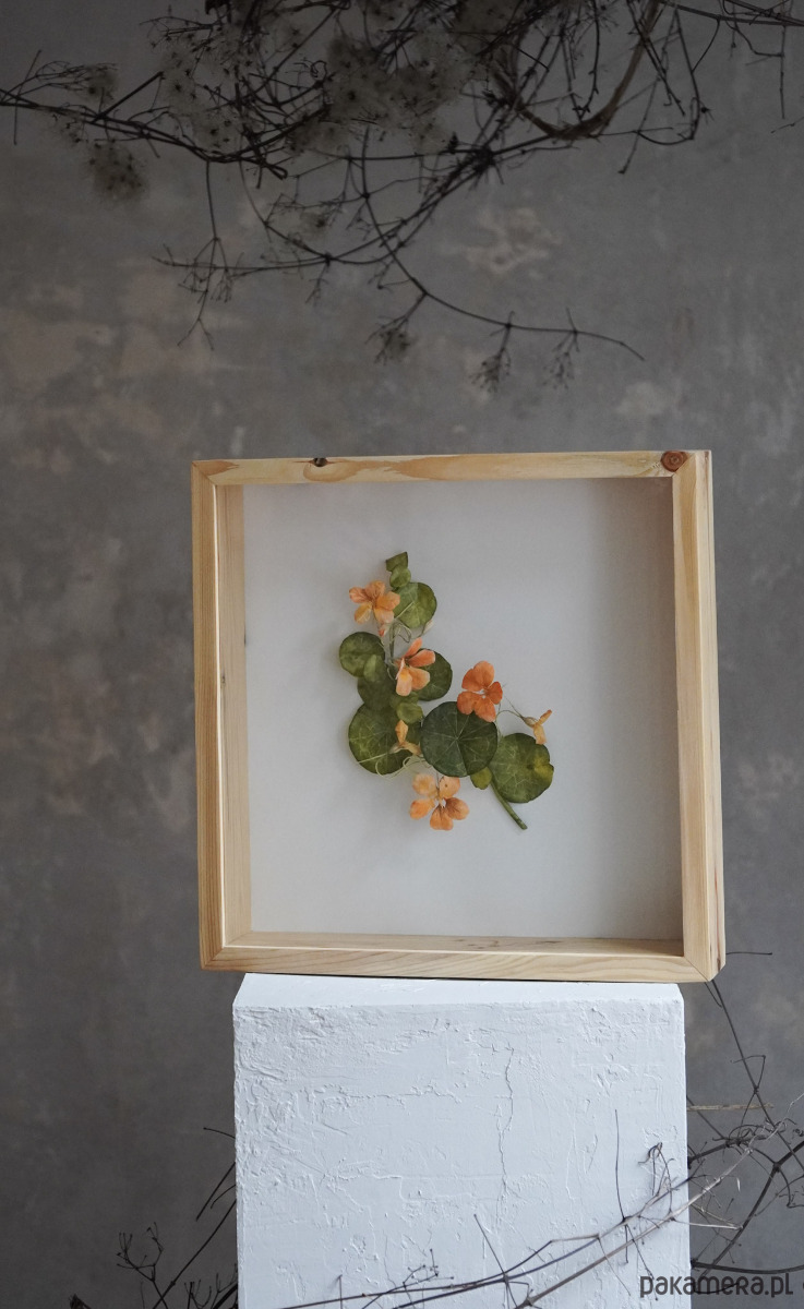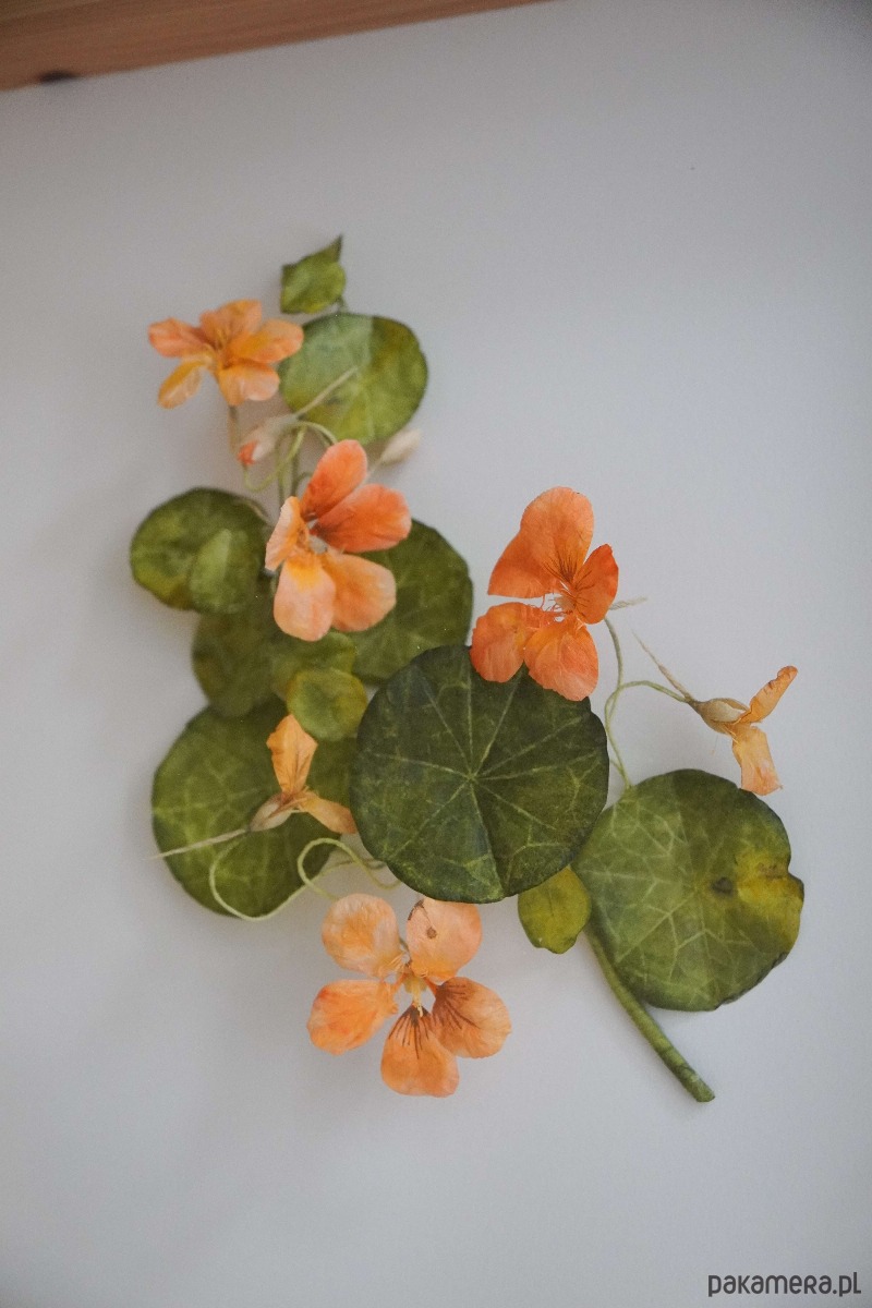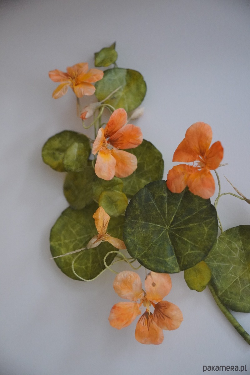 Nasturcja, którą widzisz, zamknięta w drewnianej ramie, została wykonana z papieru. Każdy z drobnych elementów został ręcznie wycięty, pomalowany i uformowany w taki sposób, by jak najwierniej oddać procesy zachodzące w naturze. Pnącze inspirowane jest realnie istniejącą rośliną i powstało z zachwytu nad jednymi z najpiękniejszych kwiatów, jakie oferuje nam przyroda.
