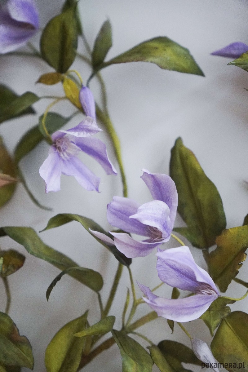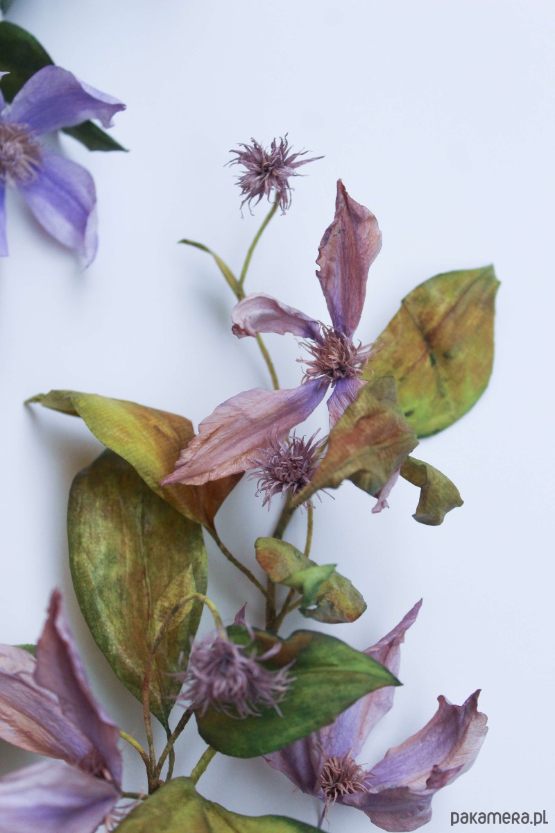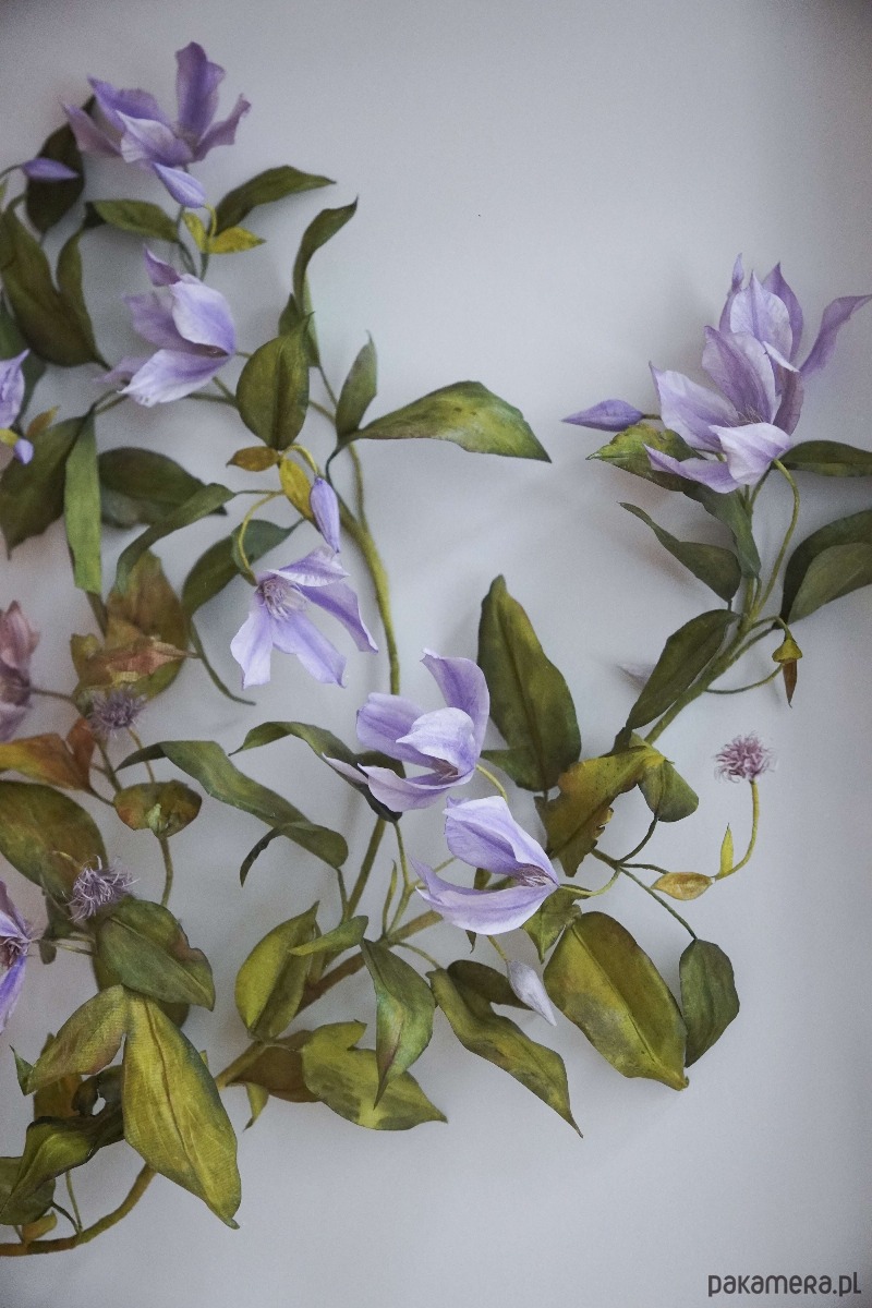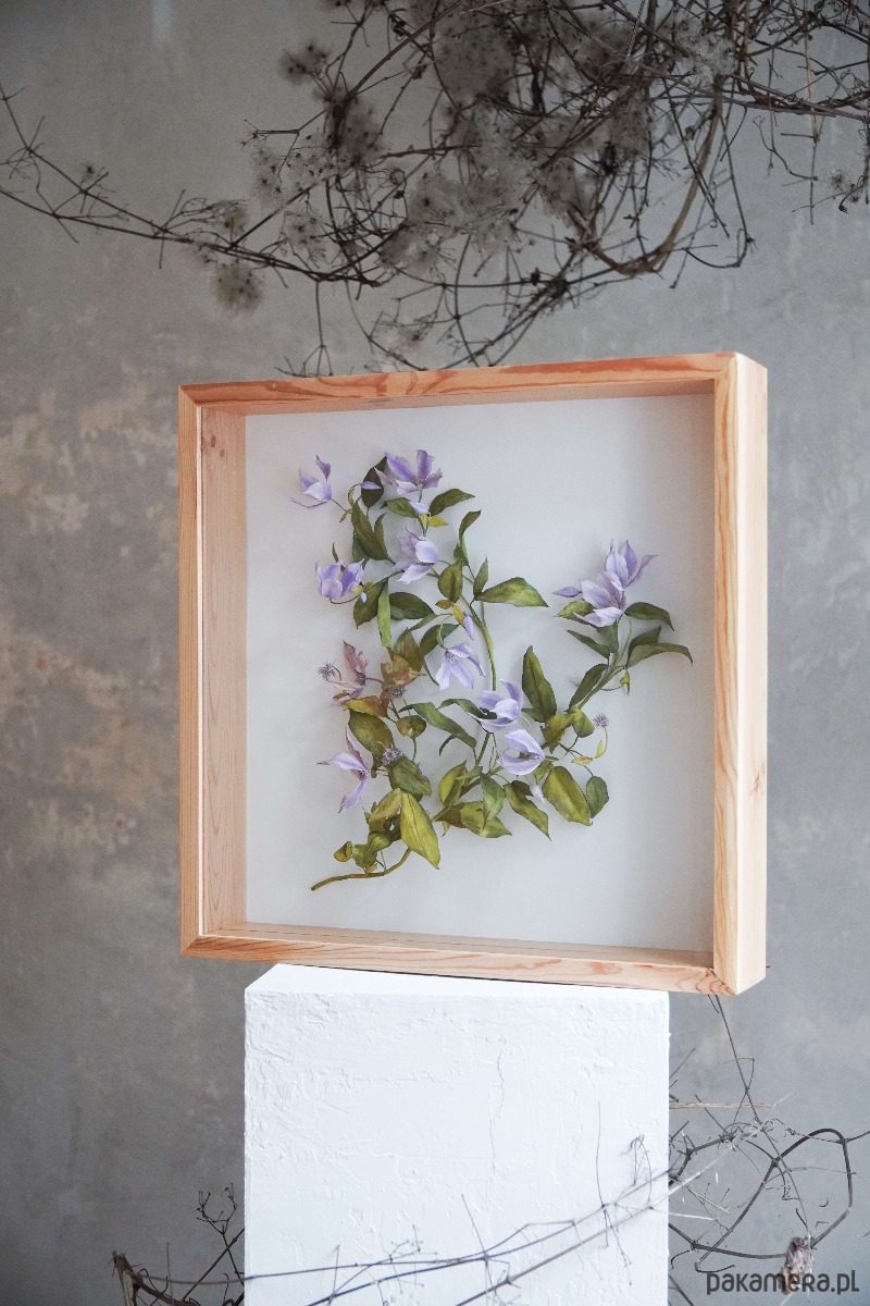 Powojnik, który widzisz zamknięty w drewnianej ramie, został wykonany z papieru. Każdy z drobnych elementów został ręcznie wycięty, pomalowany i uformowany w taki sposób, by jak najwierniej oddać procesy zachodzące w naturze. Pnącze inspirowane jest realnie istniejącą rośliną i powstało z zachwytu nad jednymi z najpiękniejszych kwiatów, jakie oferuje nam przyroda.