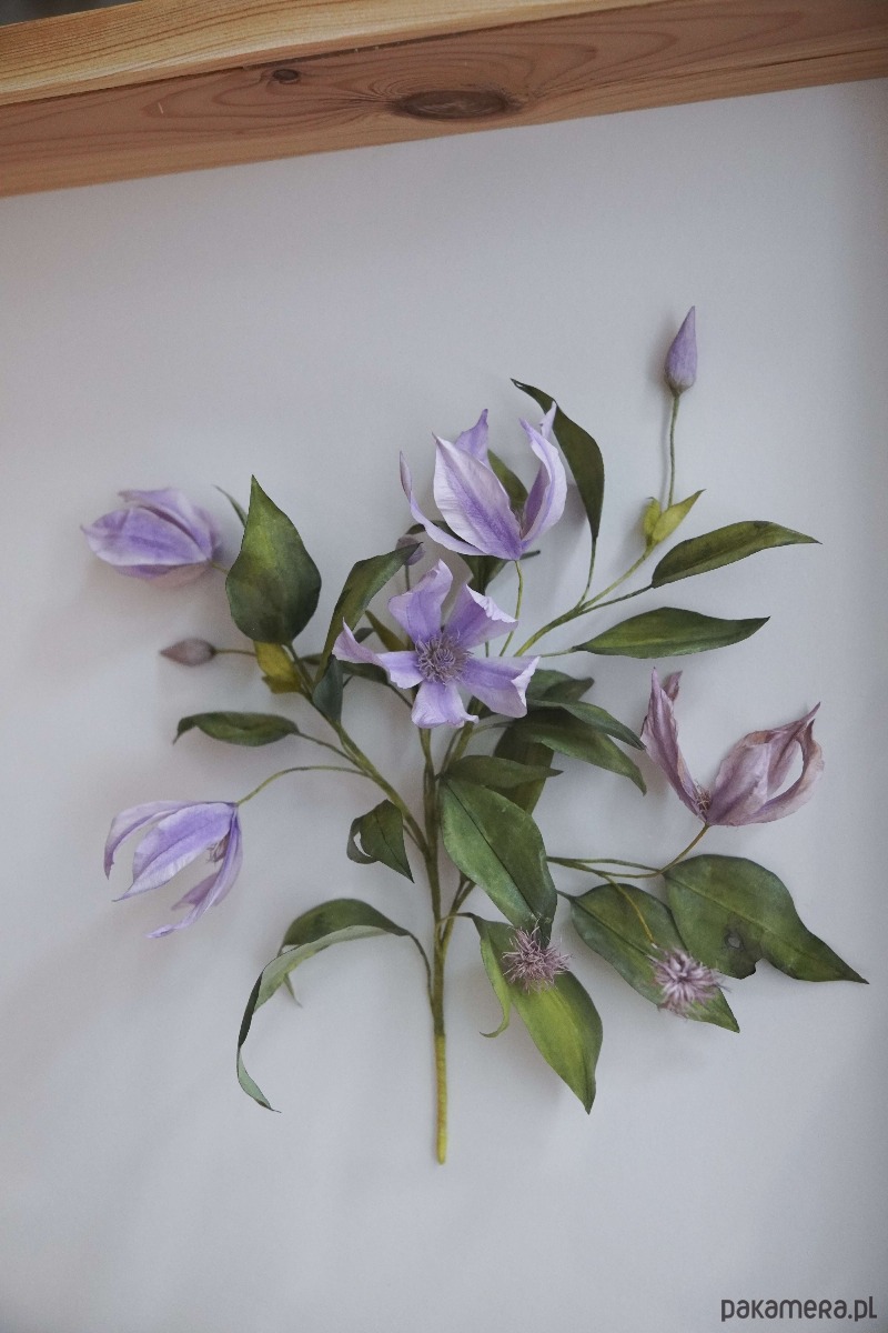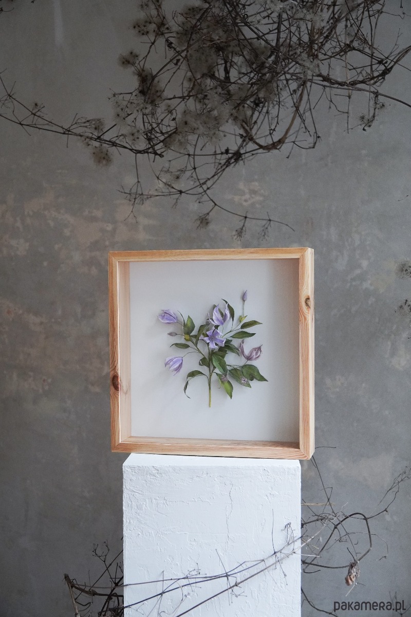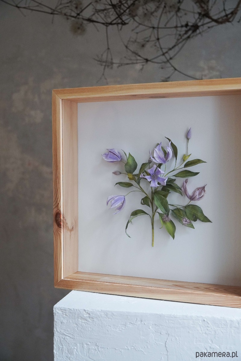 Powojnik, który widzisz zamknięty w drewnianej ramie, został wykonany z papieru. Każdy z drobnych elementów został ręcznie wycięty, pomalowany i uformowany w taki sposób, by jak najwierniej oddać procesy zachodzące w naturze. Pnącze inspirowane jest realnie istniejącą rośliną i powstało z zachwytu nad jednymi z najpiękniejszych kwiatów, jakie oferuje nam przyroda.