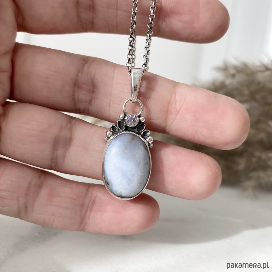 Wykonany od podstaw ręcznie, niezwykle oryginalny wisiorek z błękitnym agatem.