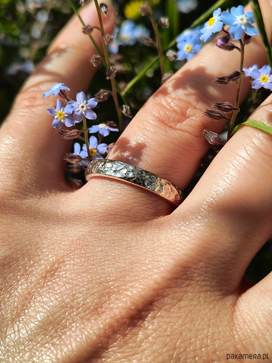 Obrączka młotkowana wykonana ze srebra próby 925.