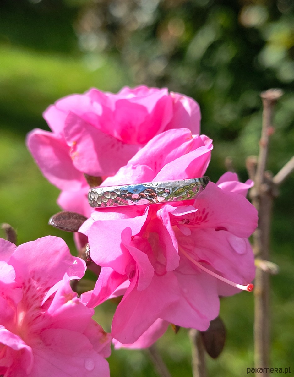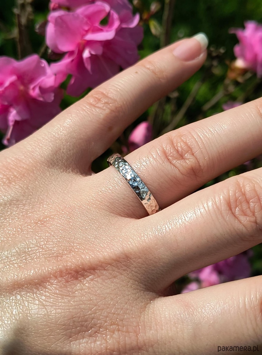 Obrączka młotkowana wykonana ze srebra próby 925.