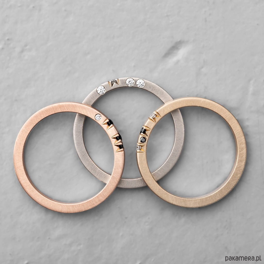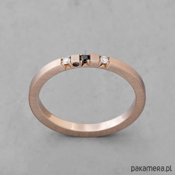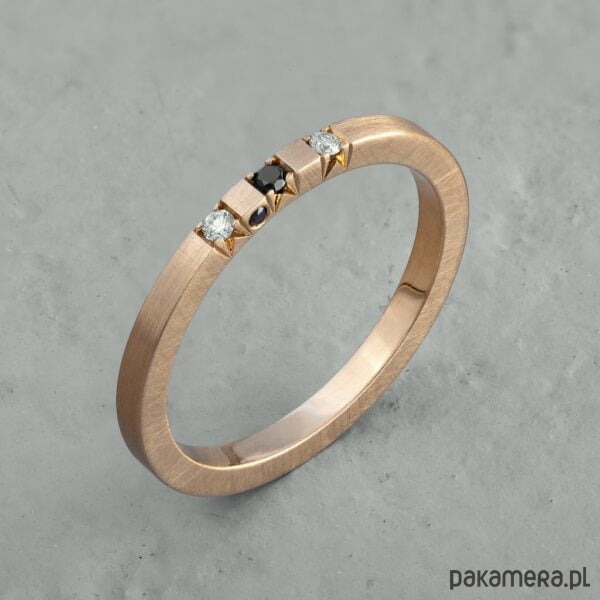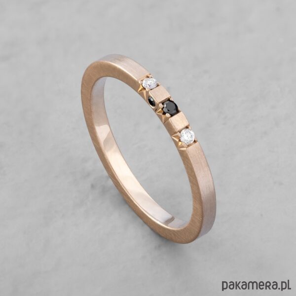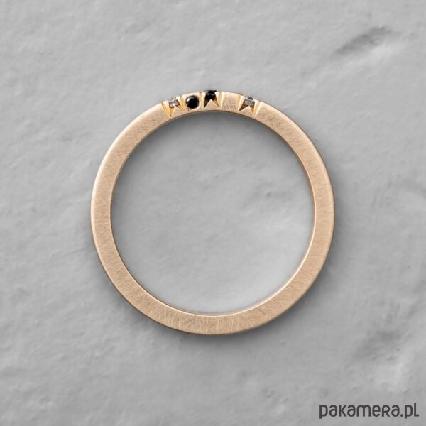 Wyjątkowa i minimalistyczna obrączka, wykonana w całości z żółtego złota próby 0,585 (14k) z pięcioma brylantami o barwie białej i czarnej. Dodatkowo powierzchnia szyny została zmatowiona, co jeszcze bardziej wydobywa blask brylantów. Jest to propozycja dla kobiet lubiących nietuzinkową biżuterię, prostą i minimalistyczną. Jeden czarny i dwa białe brylanty zostały oprawione w niewielkich odstępach, ręcznie pod mikroskopem, metodą fishtail (rybi ogon). Technika ta jest uznawana za jedną z najtrudniejszych opraw do wykonania. Brylanty są mocno odsłonięte, dzięki czemu są pięknie wyeksponowane i doskonale odbijają światło. Białe brylanty niesamowicie błyszczą na tle matowej obrączki. Ponadto asymetrycznie po bokach, na gładko zostały oprawione dodatkowe dwa czarne brylanty, o mniejszych średnicach. Takie rozmieszczenie kamieni nadaje obrączce niezwykłego charakteru. Dzięki temu może być ona noszona również jako zawieszka.