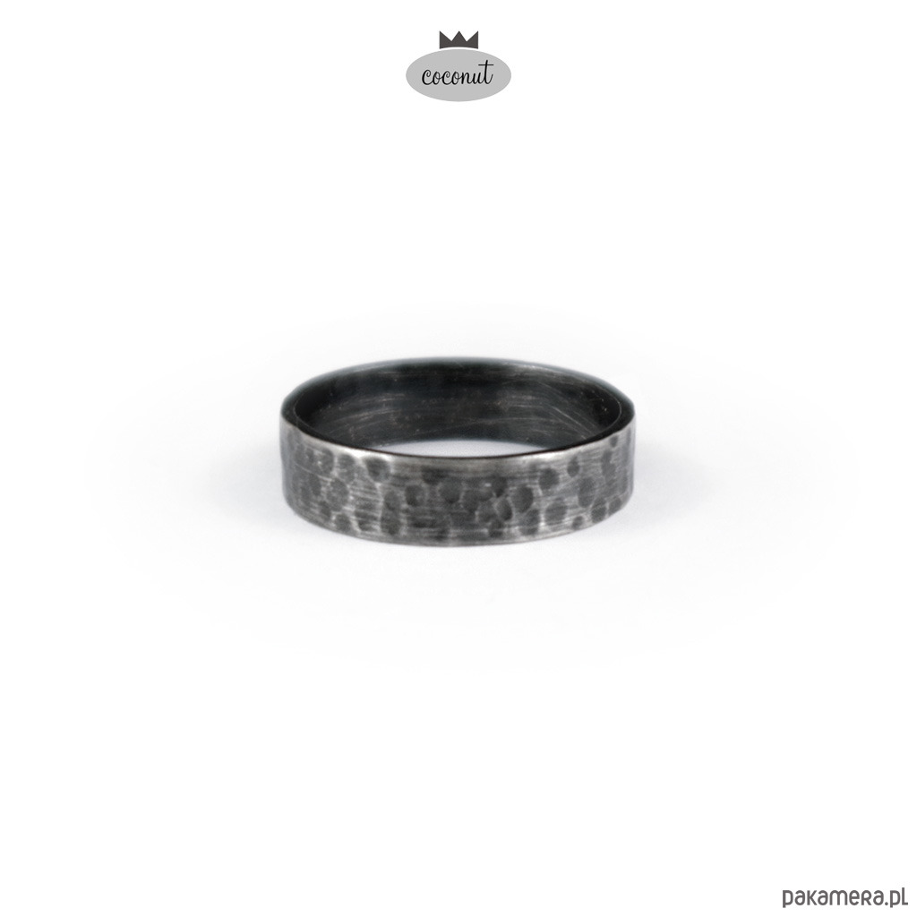 Obrączka wykonana ze srebra, fakturowana, o szerokości ok. 4 mm, grubość ok. 1 mm.