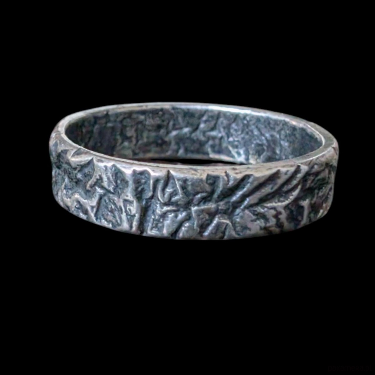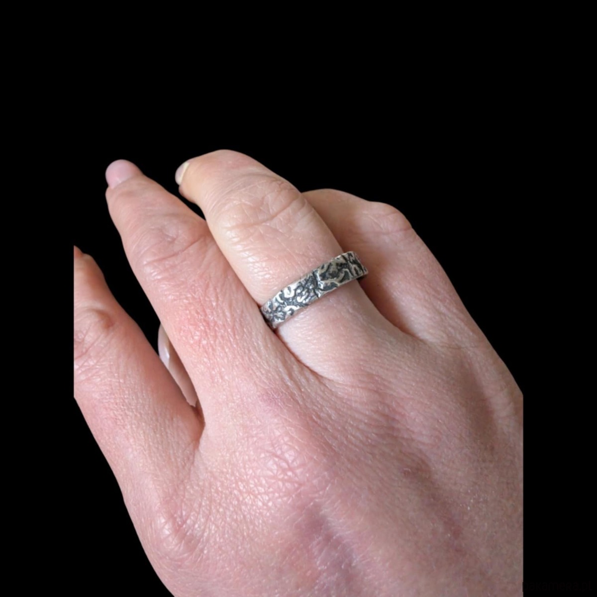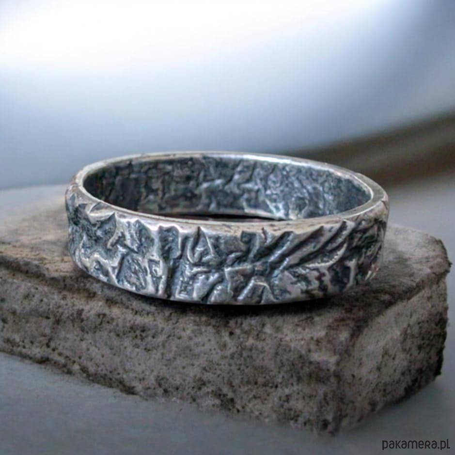 Obrączka wykonana ze srebra próby 925. Ciekawa faktura, srebro pokryte oksydą. Rozmiar jubilerski 18. Możliwe zamówienie innego rozmiaru oraz pary obrączek. Szerokość 5 mm. Waga 3,4 g. Surowa, awangardowa, oryginalna. Obrączka zostanie spakowana w ozdobne pudełeczko.