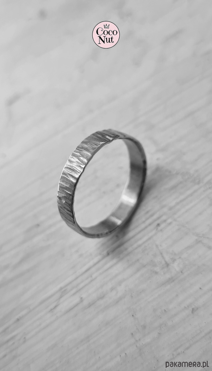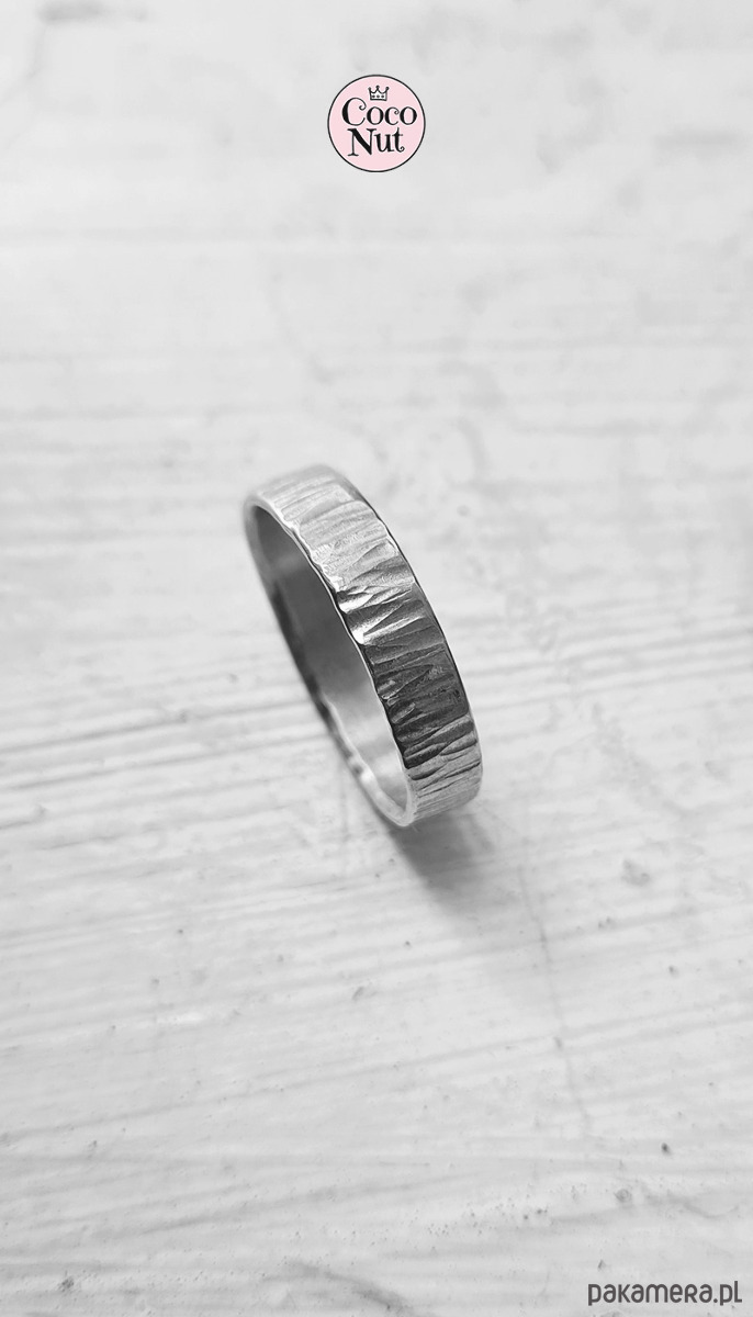 Obrączka wykonana ze srebra o szerokości ok. 5 mm.