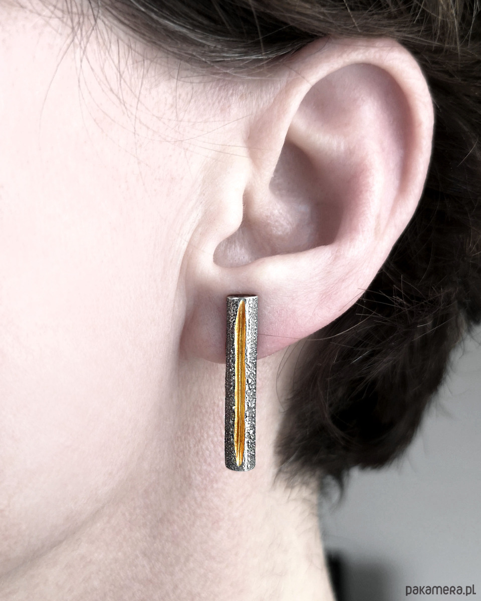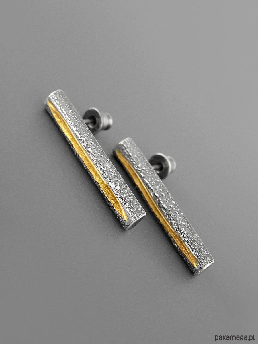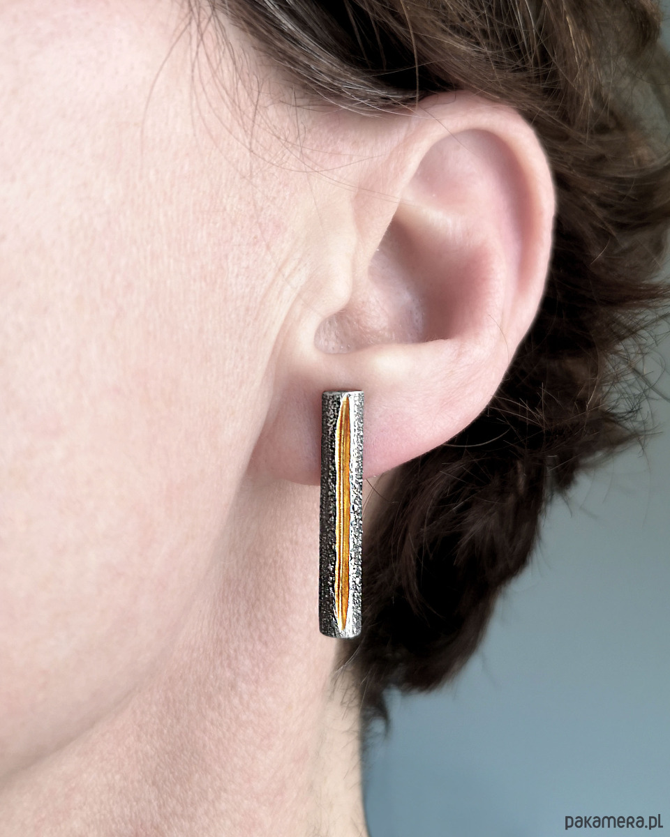 Unikatow kolczyki z linią biegnącą po środku, wykonana ze srebra 925 z unikatową flamowaną fakturą.