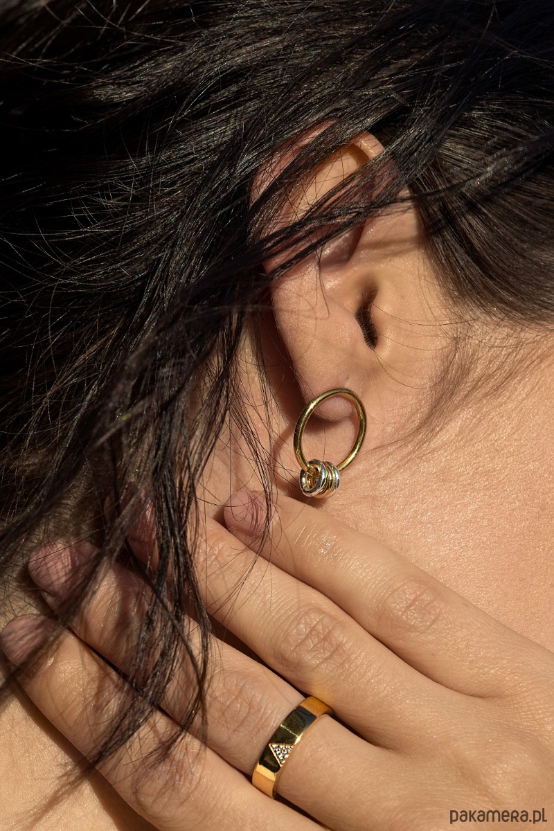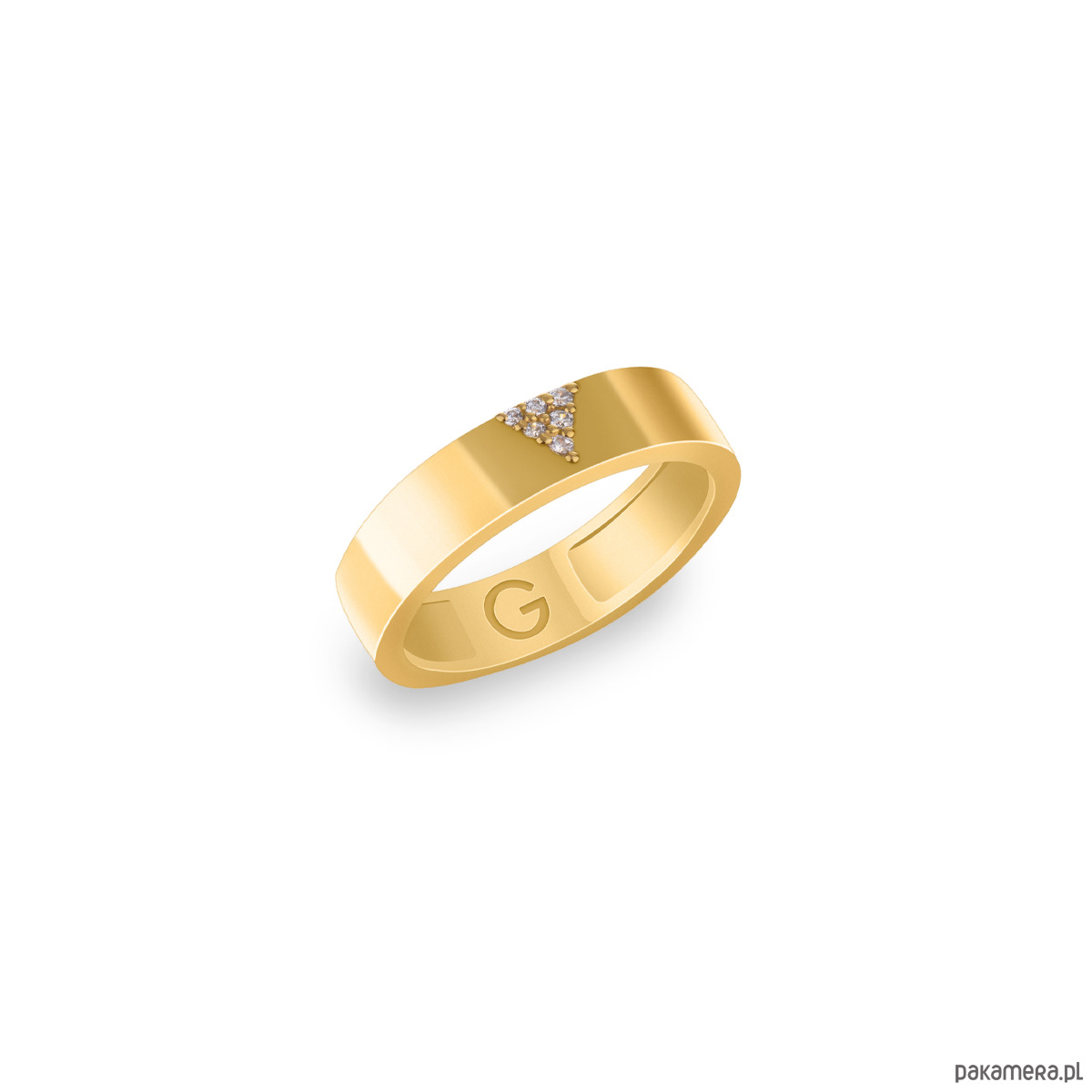 Minimalistyczna złocona obrączka ozdobiona sześcioma białymi cyrkoniami, które tworzą trójkąt. W wewnętrznej części logo marki.