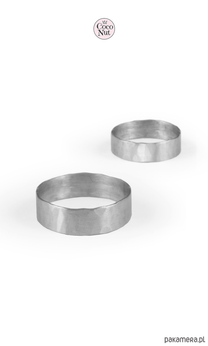 Obrączka wykonana ze srebra, młotkowana (nieco nieregularna faktura), oksydowana, o szerokości ok. 5 mm, po zakupie prosimy o podanie rozmiaru.