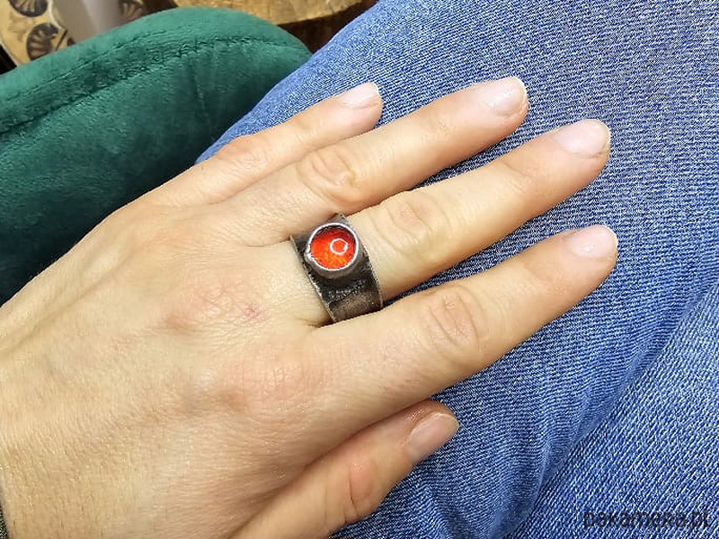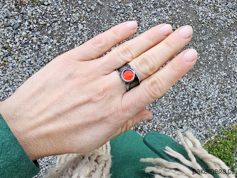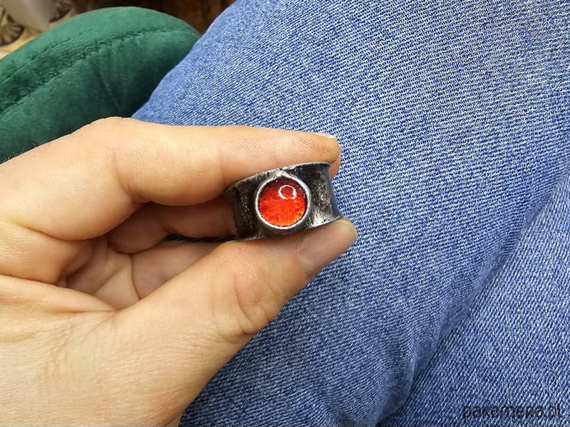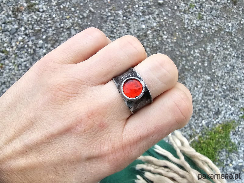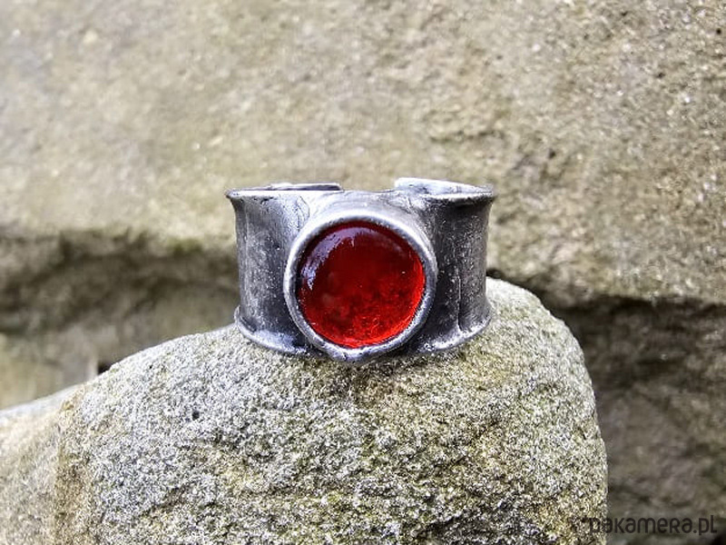 Pierścionek w formie obrączki z czerwonym szklanym oczkiem.