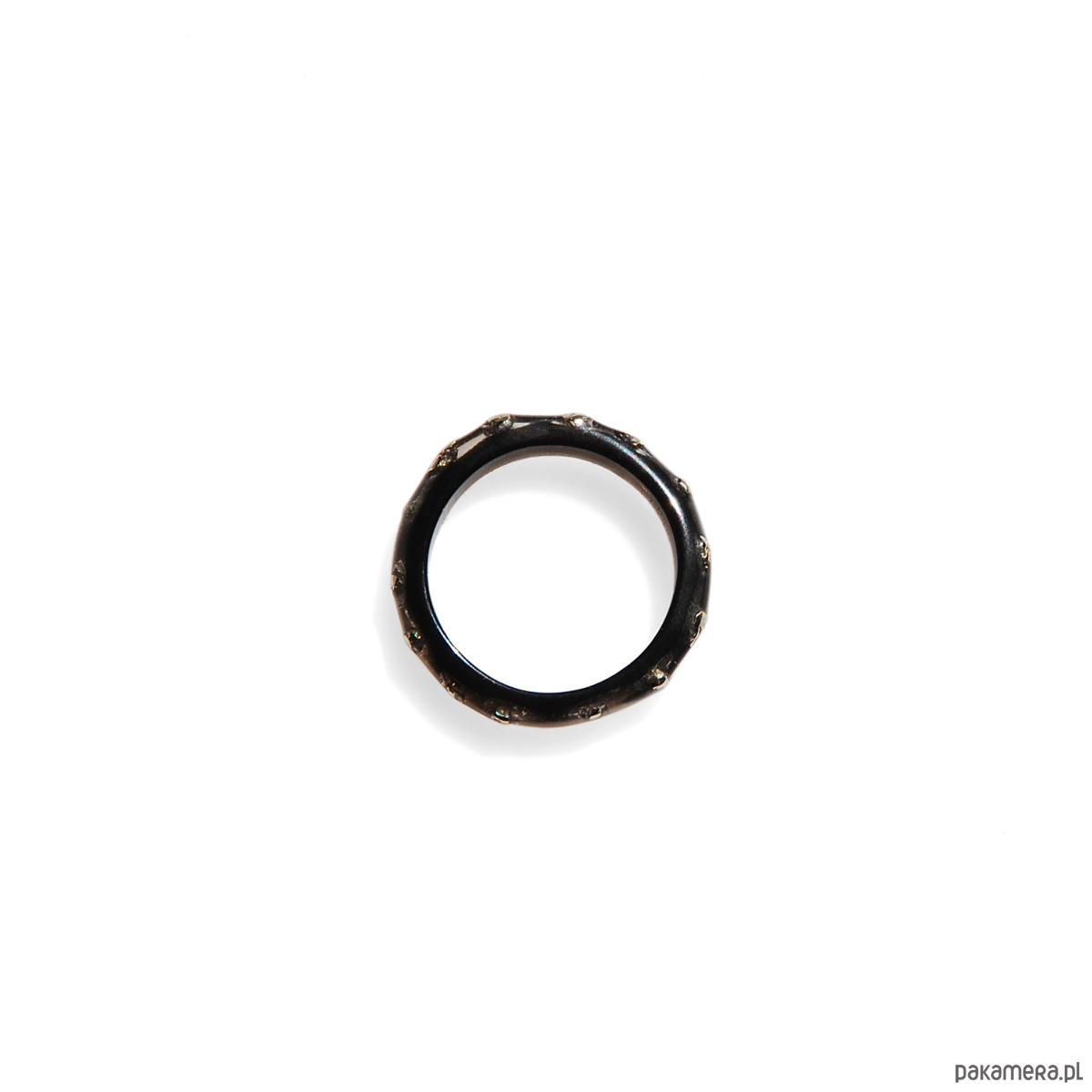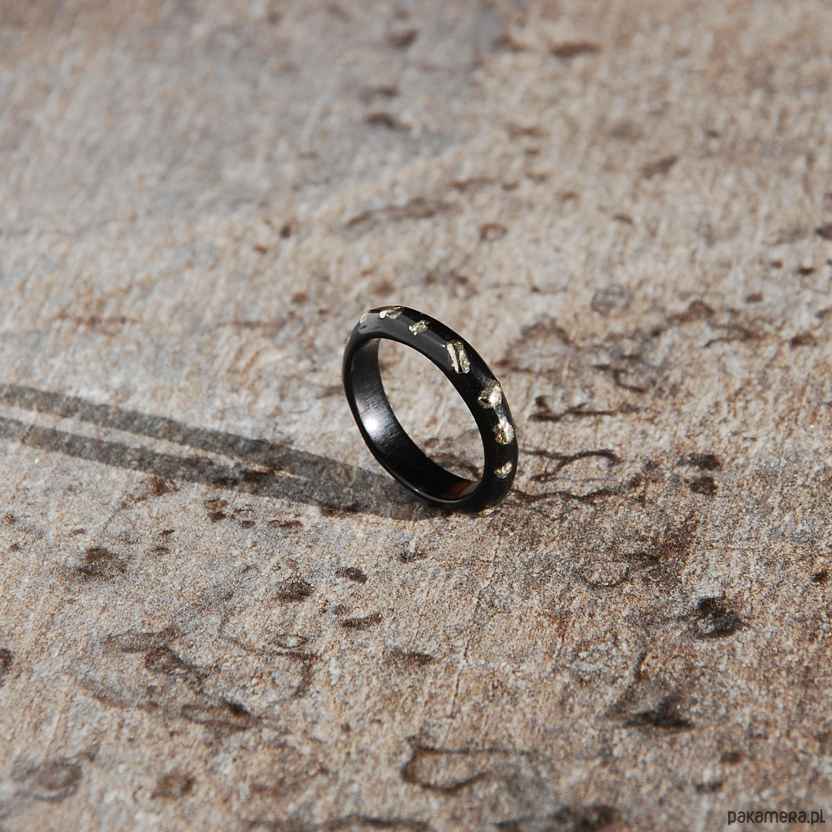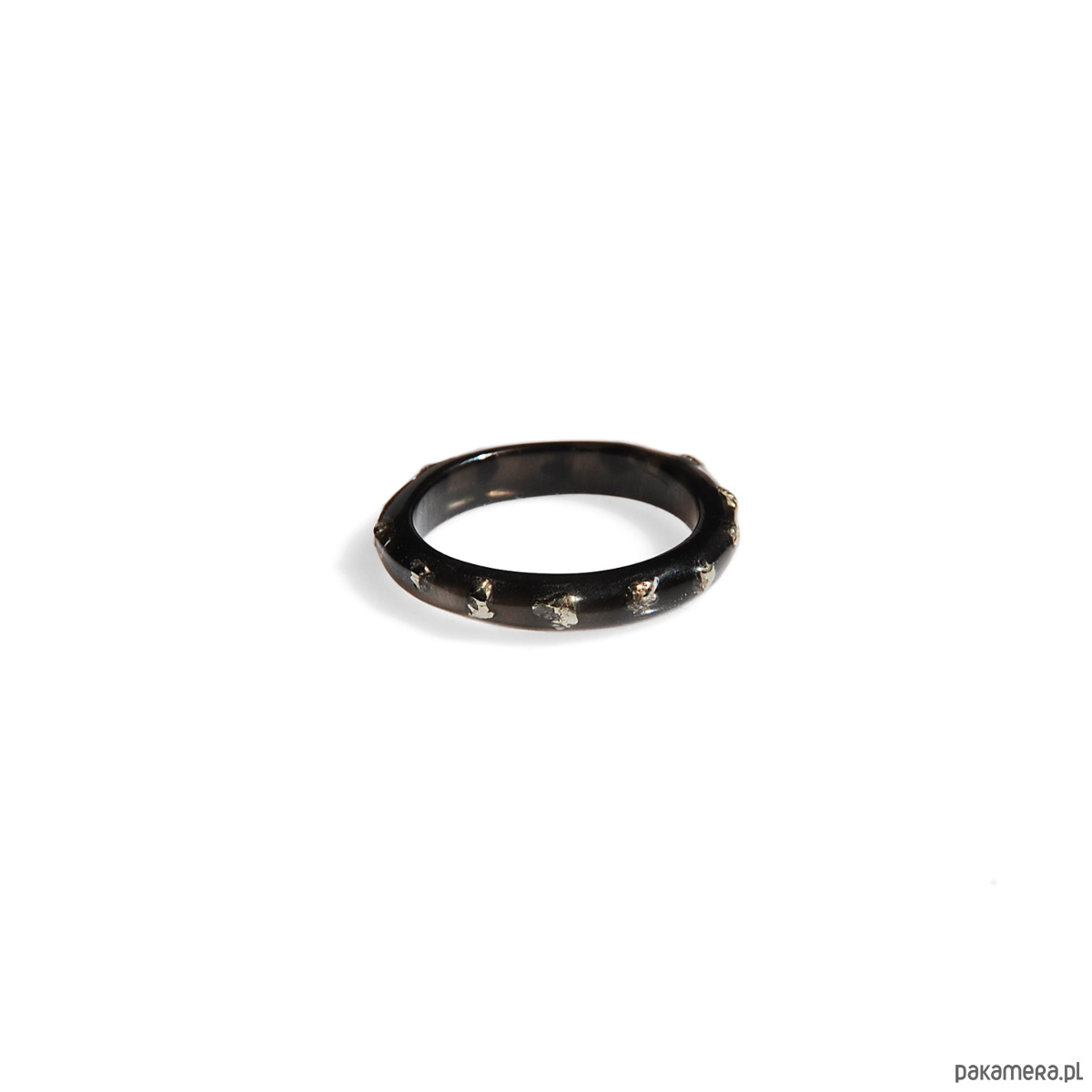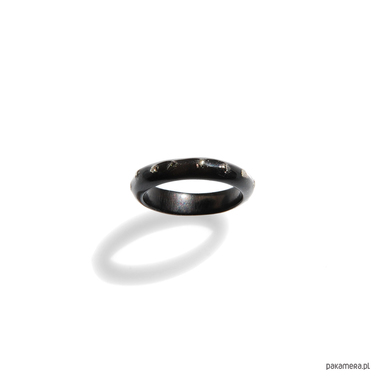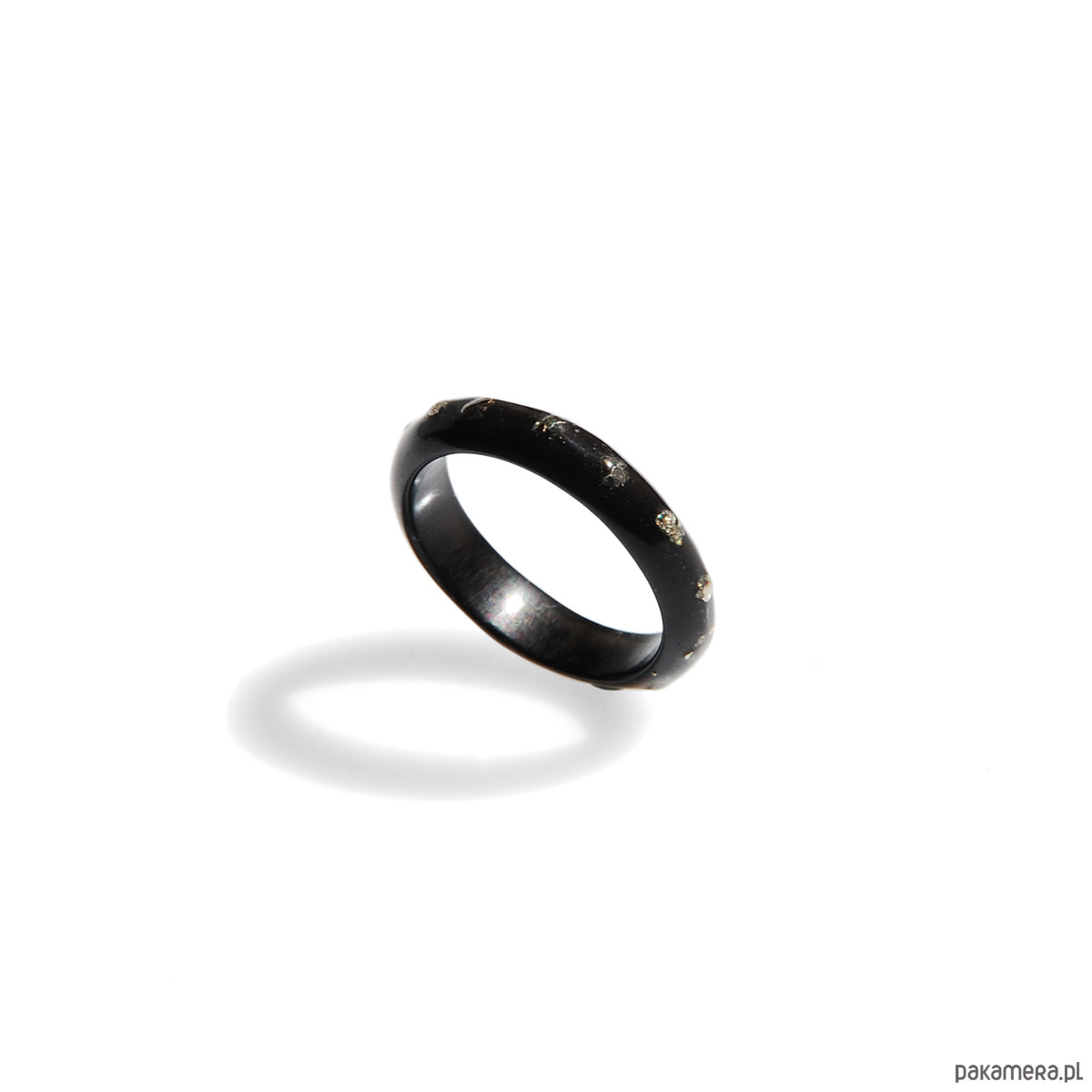 Delikatna obrączka wykonana z ponad piętnastu naturalnych pirytów zatopionych w transparentnej i czarnej żywicy jubilerskiej wypolerowanej na wysoki połysk.