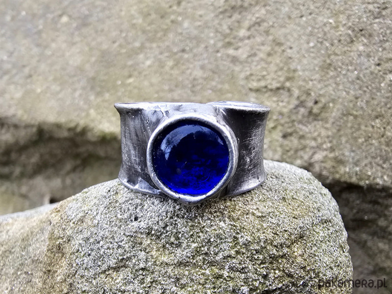 Pierścionek w formie obrączki z szafirowym szklanym oczkiem.