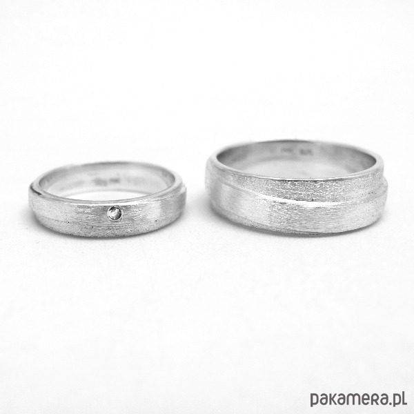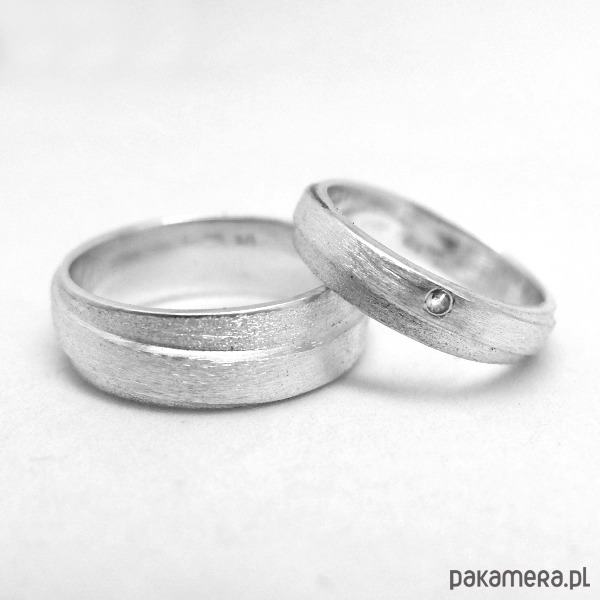 Komplet obrączek z białego złota próby 0,585 - 14 K. Męska jest szeroka na 8 mm, damska na 4 mm i ma oprawiony diament 0,015 karatów o jakości SI/H.