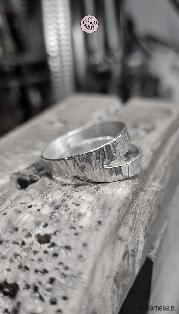 Dwie obrączki wykonane ze srebra o szerokości ok. 3 i 4 mm.