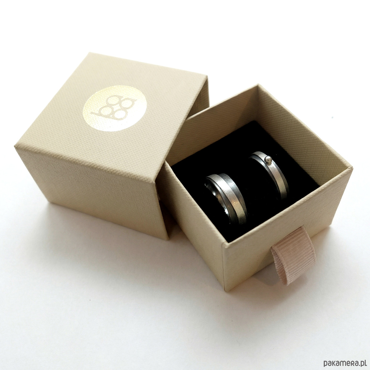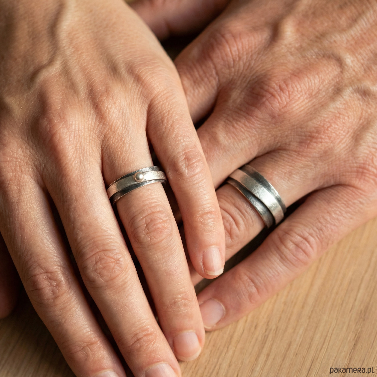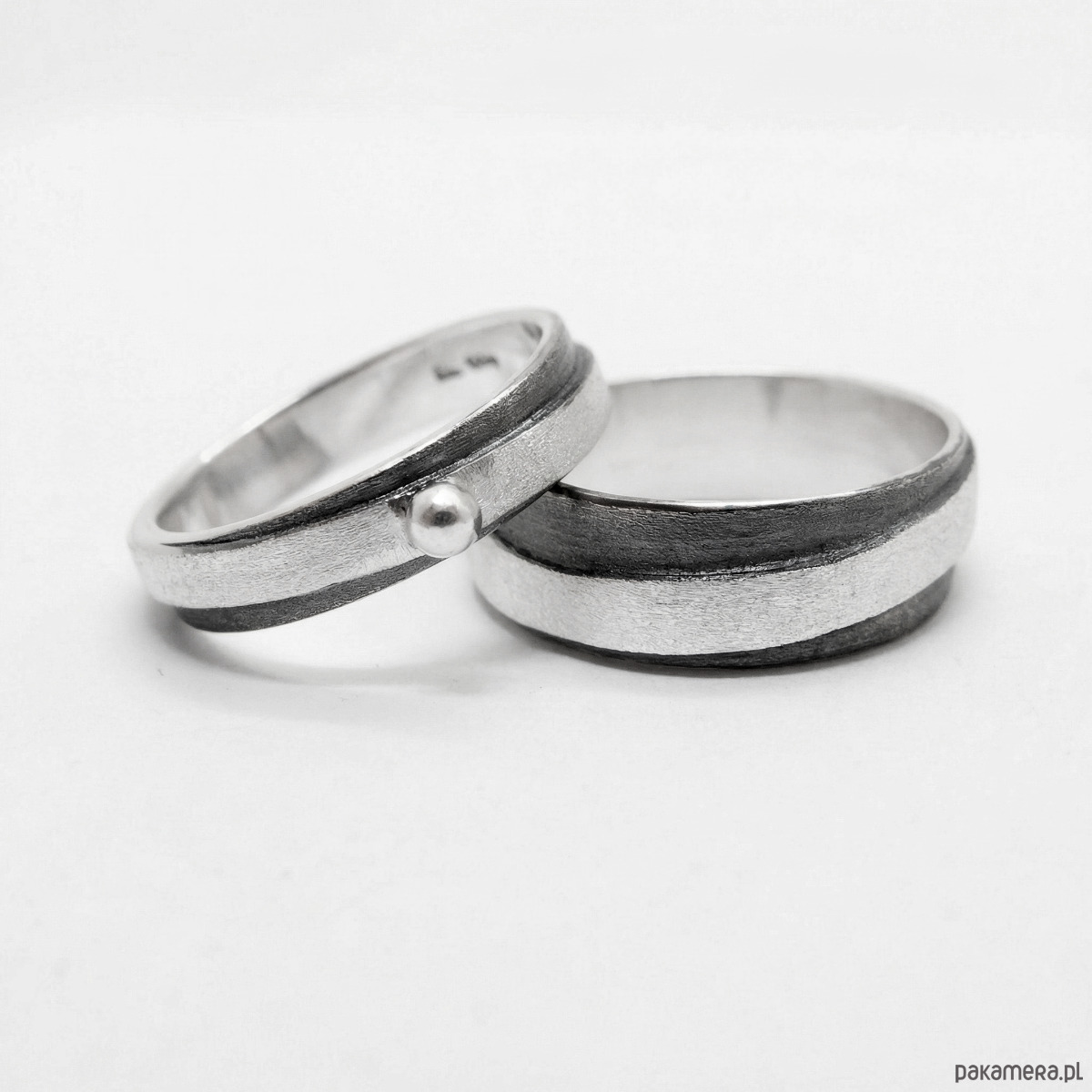 Obrączki srebrne częściowo oksydowane. Powierzchnia obrączek jest satynowa, wewnątrz są wypolerowane. Są szerokie na 7 mm i 4 mm. Węższa obrączka ma ozdobną srebrną kulkę.