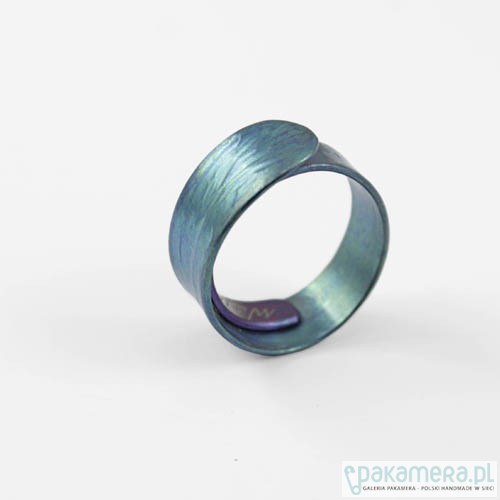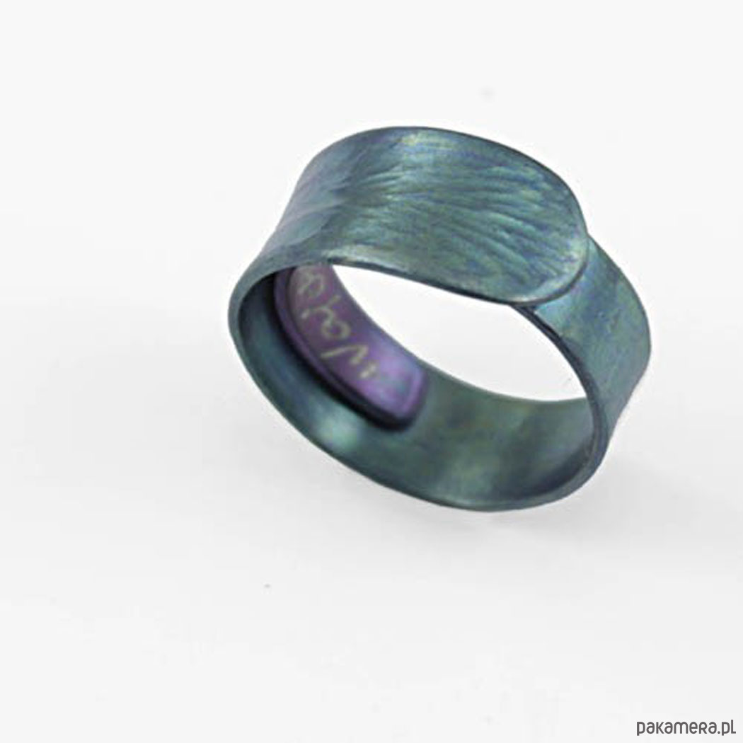 Nowoczesna obrączka zrobiona ręcznie z tytanu anodowanego(pokrytego tlenkami metodą elektro-chemiczną). Obrączka jest niezwykle trwała a kolory pozostają "żywe" przez lata. Lekka i wygodna w noszeniu.Sygnowana wygrawerowanym podpisem.Rozmiar nr.20, z możliwością regulacji,szerokość 1,0 cm . Mogę wykonać bardzo podobną w innym rozmiarze.