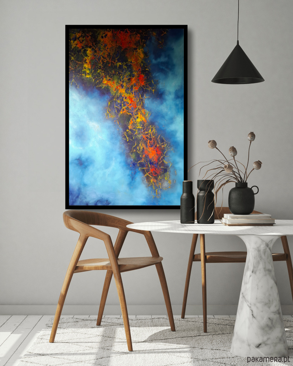 Obraz strukturalny, którego powierzchnia przywodzi na myśl lawę lub bursztyn scalający przestrzeń. Ciepłe odcienie bursztynu kontrastują z chłodnymi turkusami i błękitem, nasuwając skojarzenia z lądem i wodą. Warstwy farby tworzą głębię i rytm, a strukturalne formy pozwalają odbiorcy odkrywać zarówno organiczne, jak i abstrakcyjne kształty.