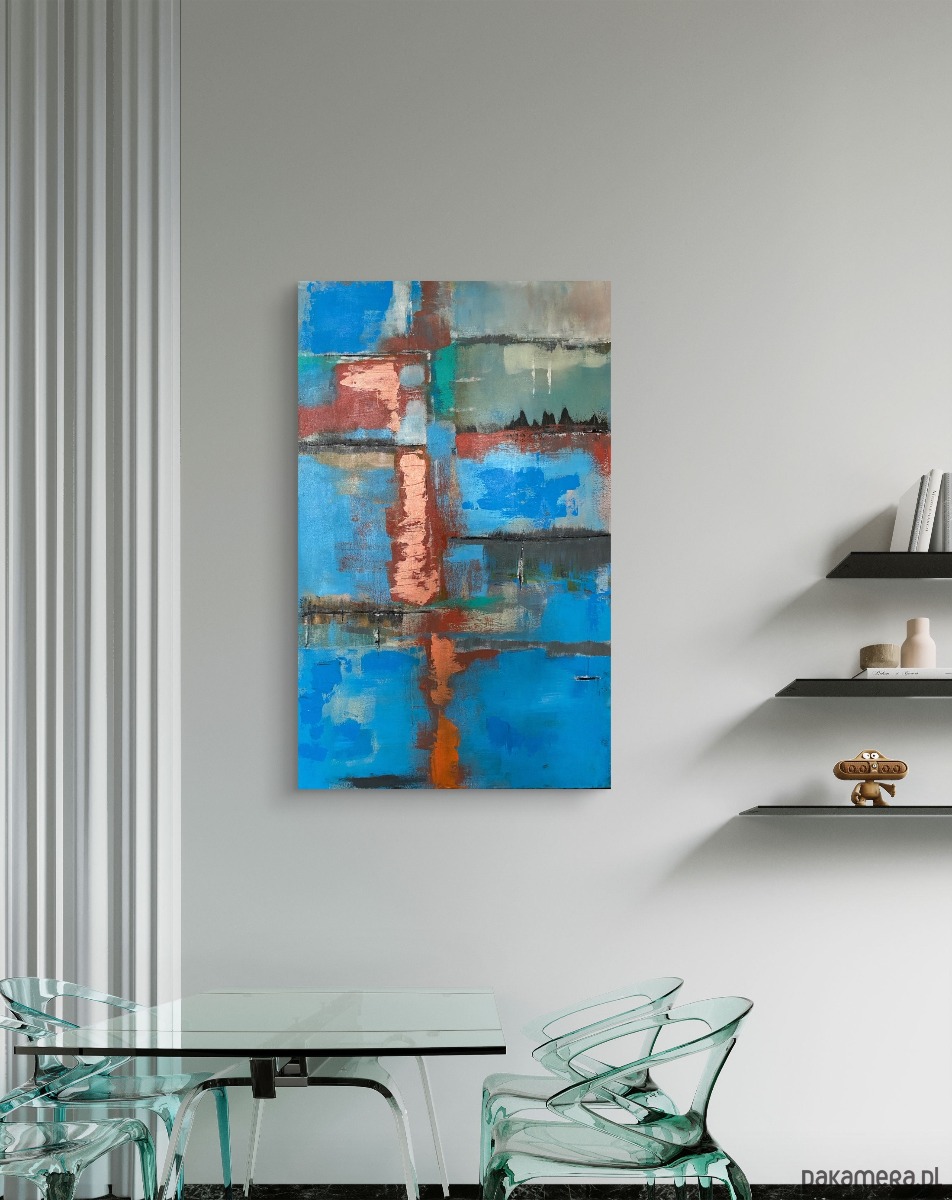 Ciepłe, rdzawo-złote akcenty wprowadzają kontrast i symbolizują energię, która przenika spokój – subtelne napięcie obecne pod powierzchnią. Pionowa struktura nadaje kompozycji charakteru i przyciąga wzrok, tworząc mocny, a zarazem elegancki punkt centralny.