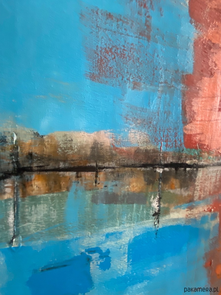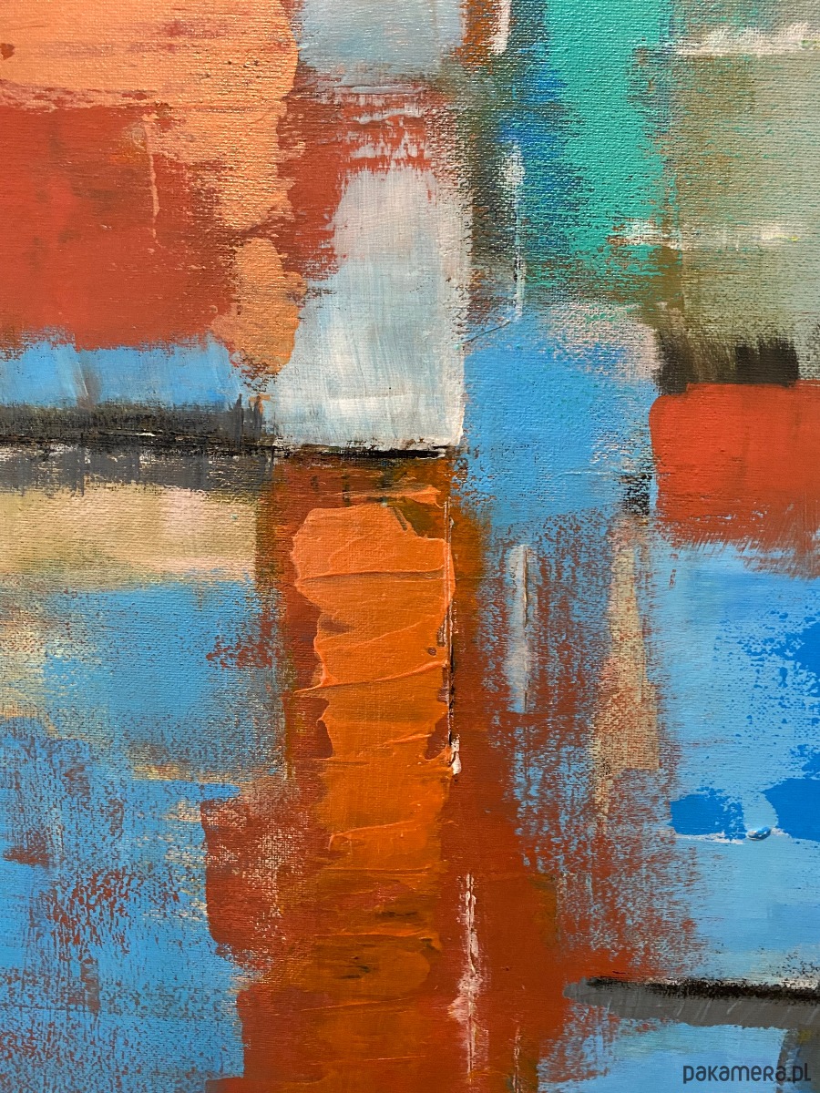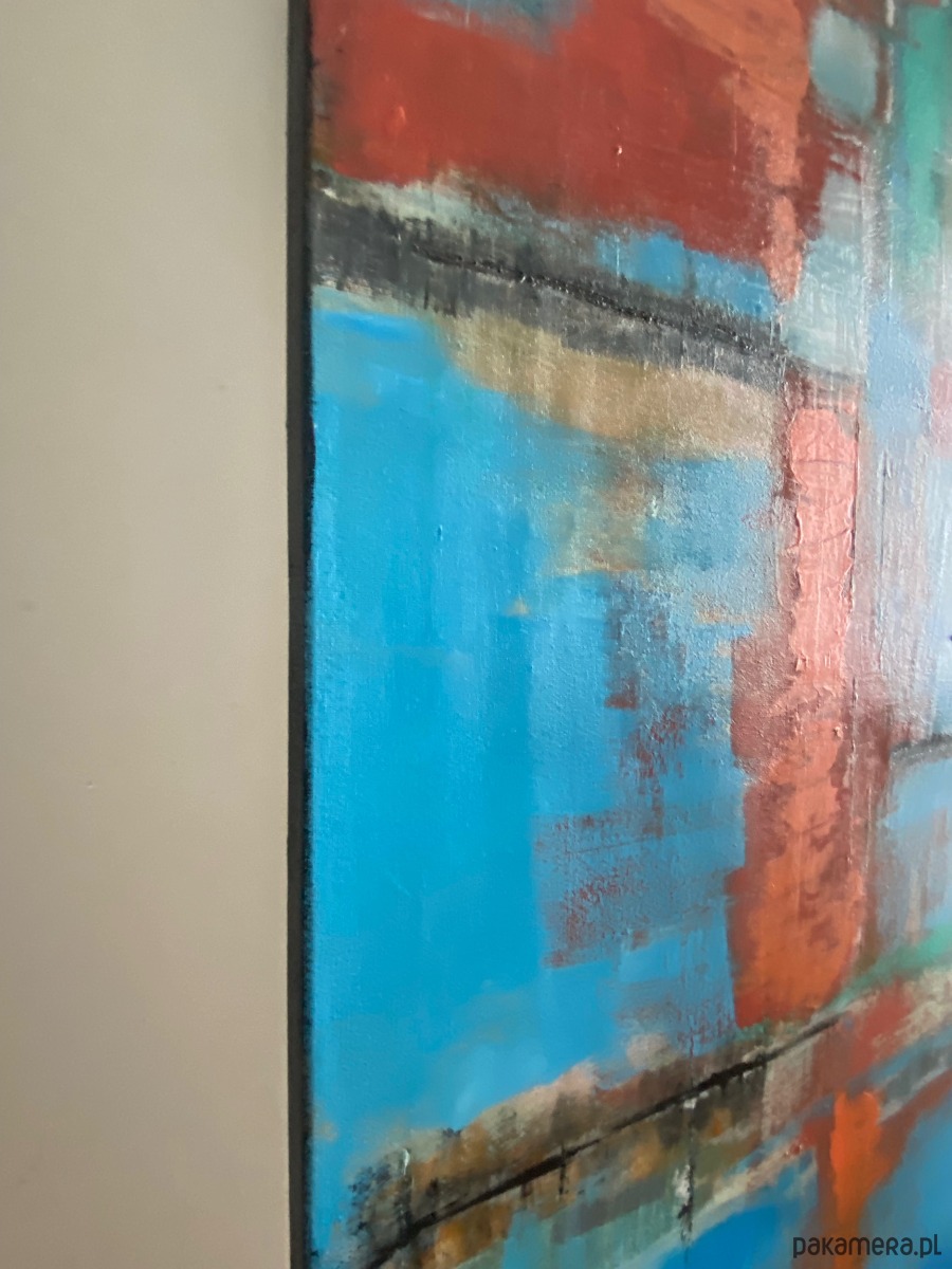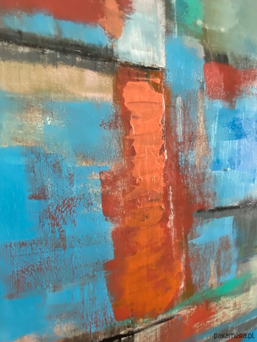 Widoczna faktura i warstwowość farby podkreślają autentyczność oraz ręczne wykonanie pracy. Obraz zmienia swój odbiór w zależności od światła – w naturalnym wydobywa subtelne przejścia tonalne, w sztucznym nabiera głębi i nastrojowego wyrazu.