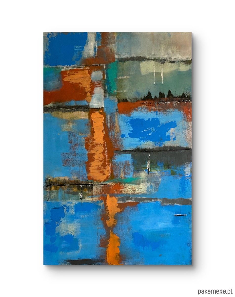 Obraz ręcznie malowany 60 na 90 cm, malowany farbami akrylowymi na podobrazie bawełnianym -„Emocje I – punkt widzenia” to abstrakcyjna opowieść o przestrzeni i wewnętrznym wyciszeniu. Dominujący, intensywny błękit buduje wrażenie nieskończoności – jak spokojna tafla wody lub bezkresne niebo tuż przed zmierzchem.