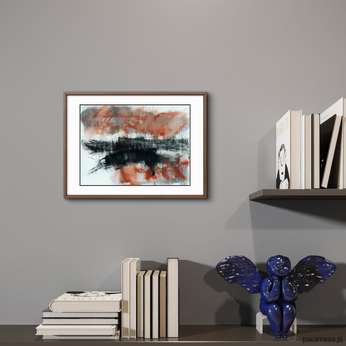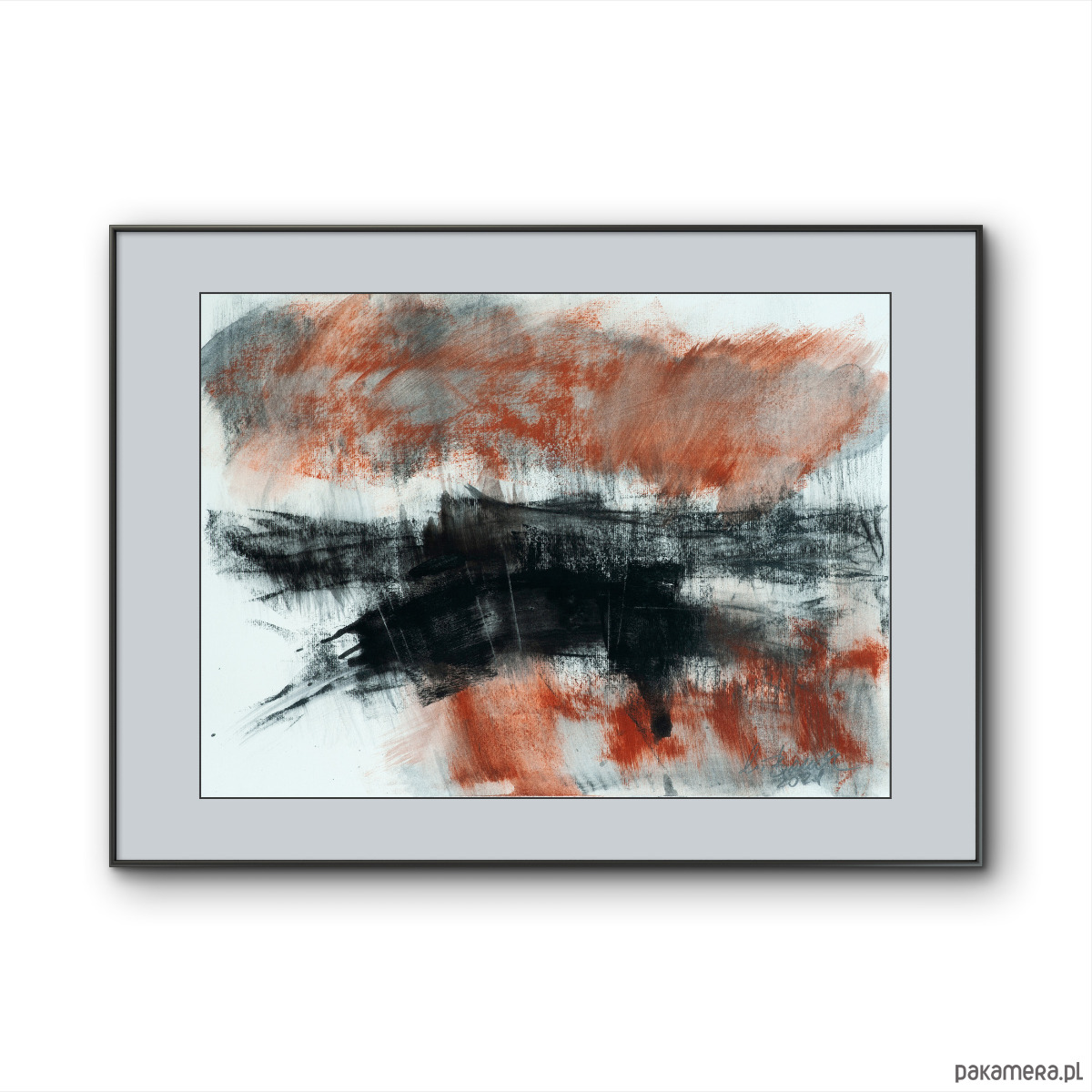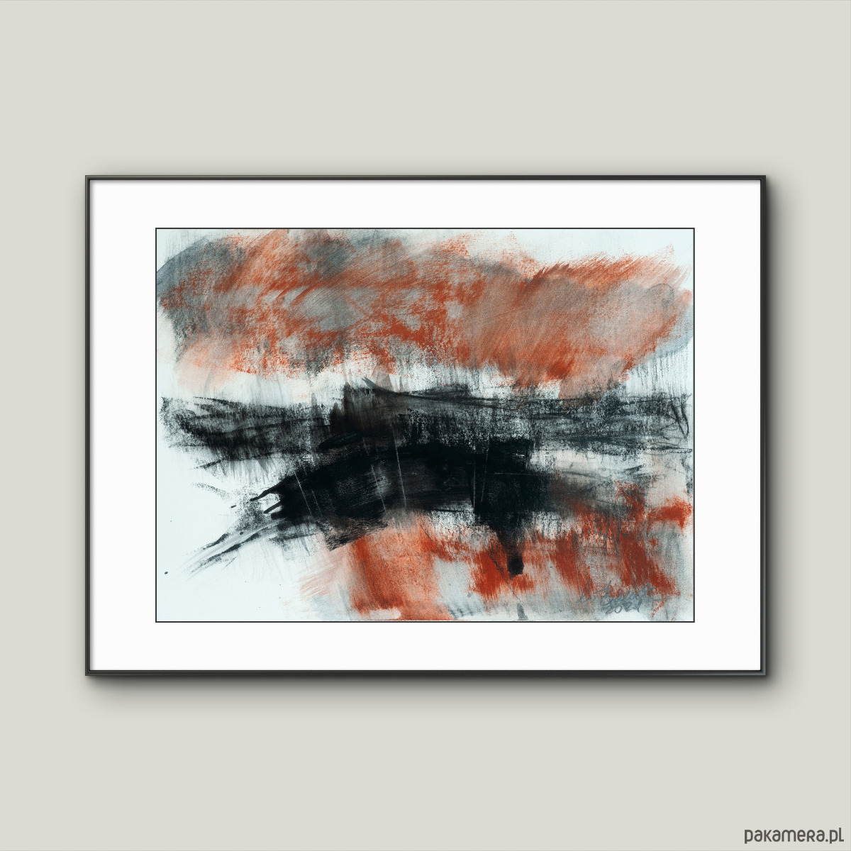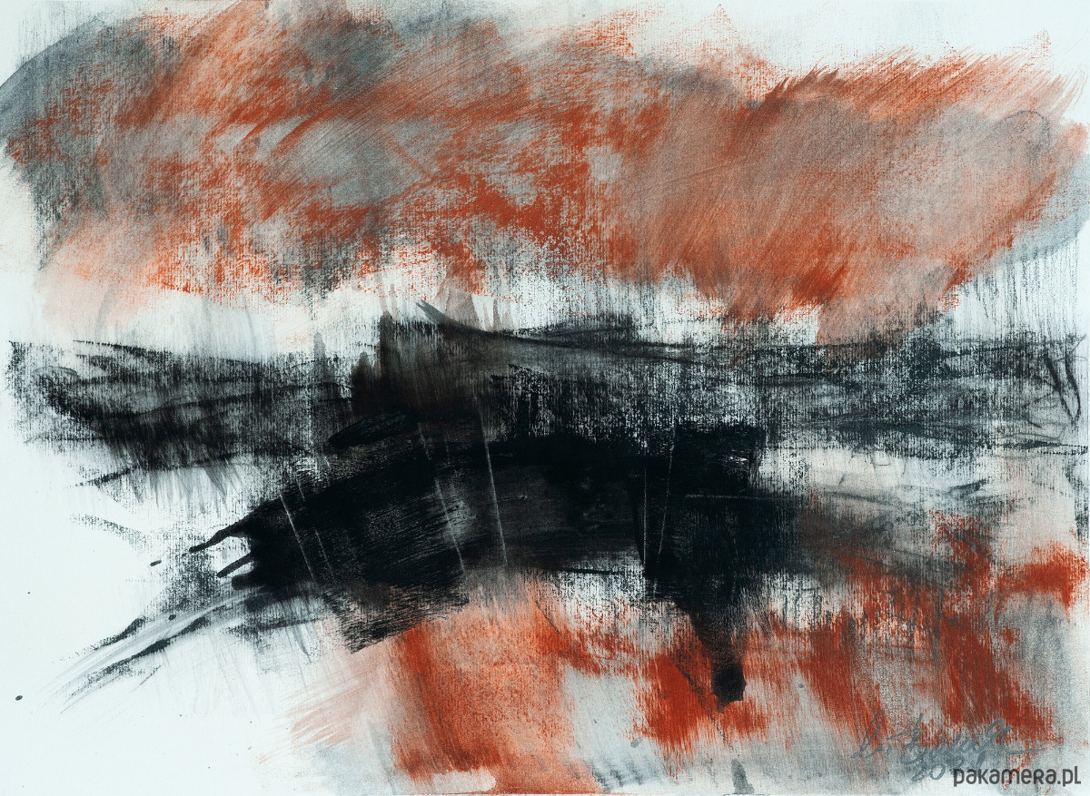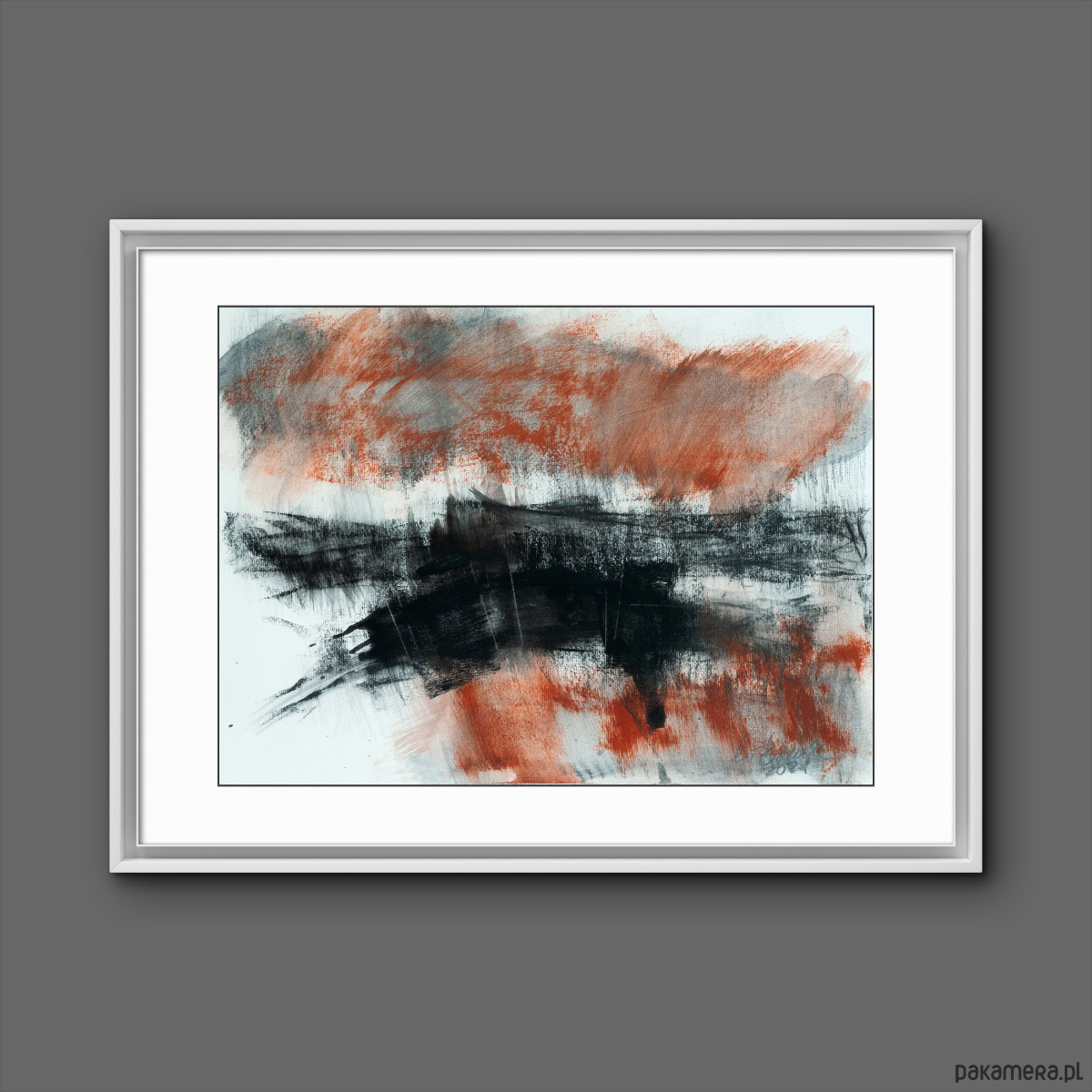 Obraz abstrakcyjny grafit, sangwina oraz sucha pastela na papierze Fabriano. Obraz utrzymany w wyraźnej tonacji.