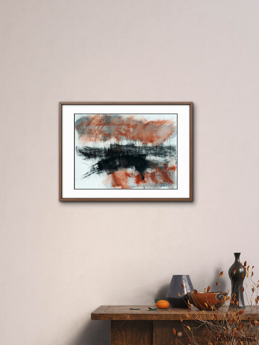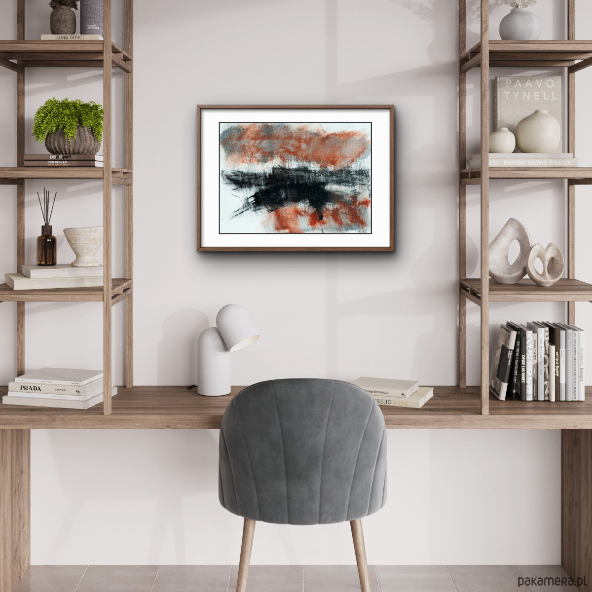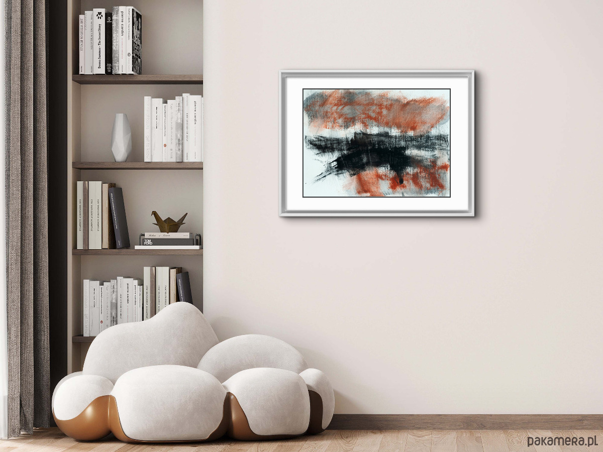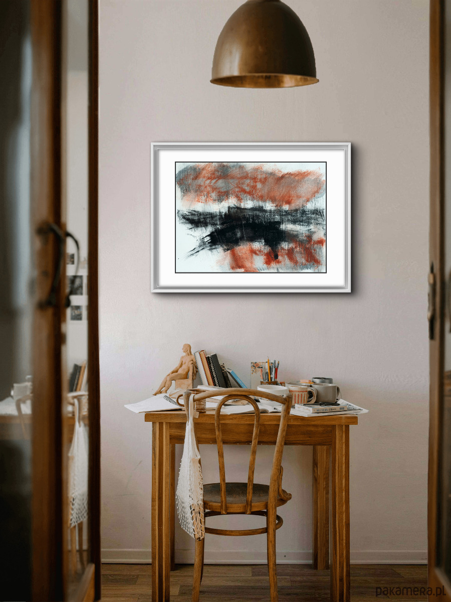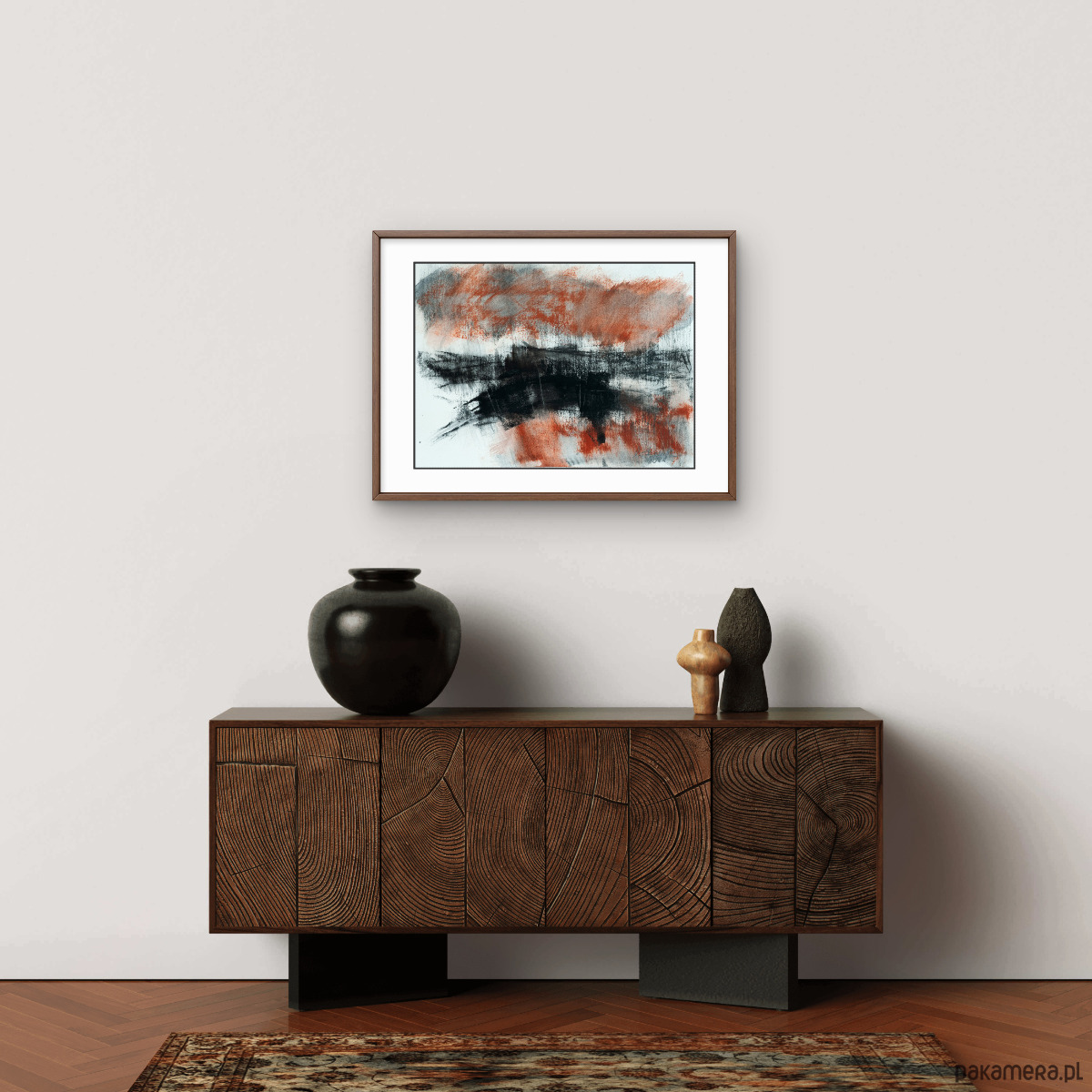 Obraz abstrakcyjny grafit, sangwina oraz sucha pastela na papierze Fabriano. Obraz utrzymany w wyraźnej tonacji.