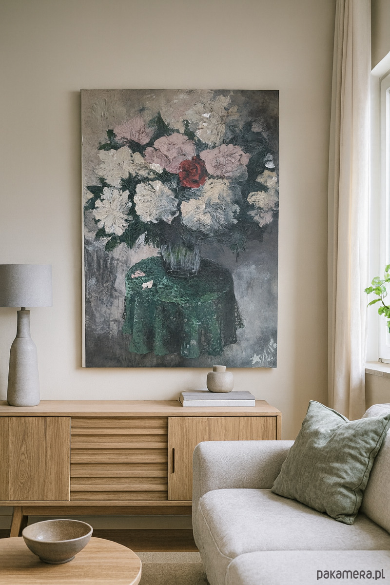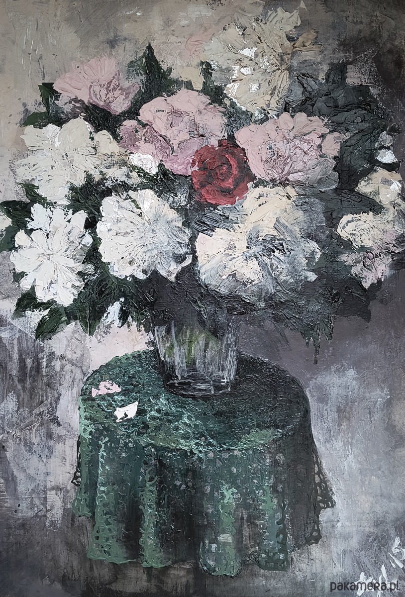 🌷 Obraz przedstawia bukiet wiosennych kwiatów: peoni oraz róży na małym stoliczku z dzierganym obrusem.